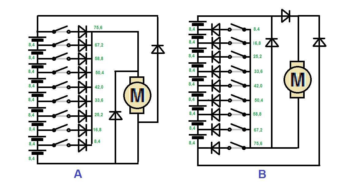 запаралелил батарею с 66в на 33 в и включив мотор рычагом реверса, поехал +- 40 кмч с расходом 34 втчкм............