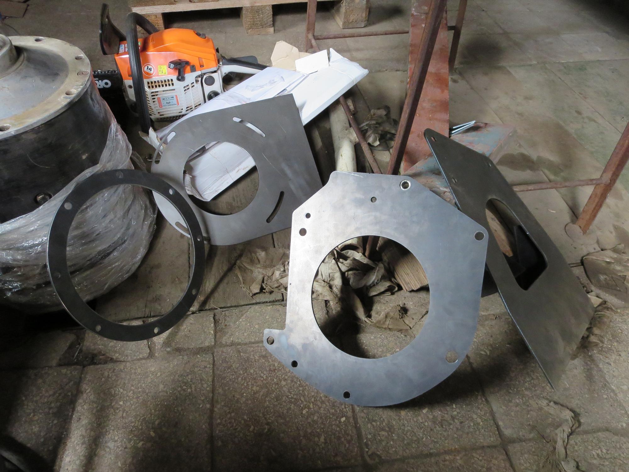 Для стыковки мотора с коробкой заказал на лазере заготовки. Сталь 5мм. Прикрутил заготовки на двигатель и КПП. Затем установил и отцентровал КПП на двигателе в вертикальном положении и расставил 4 шт стальных пластины равномерно по кругу, чтобы получилась пространственная конструкция. Соединил все сваркой.