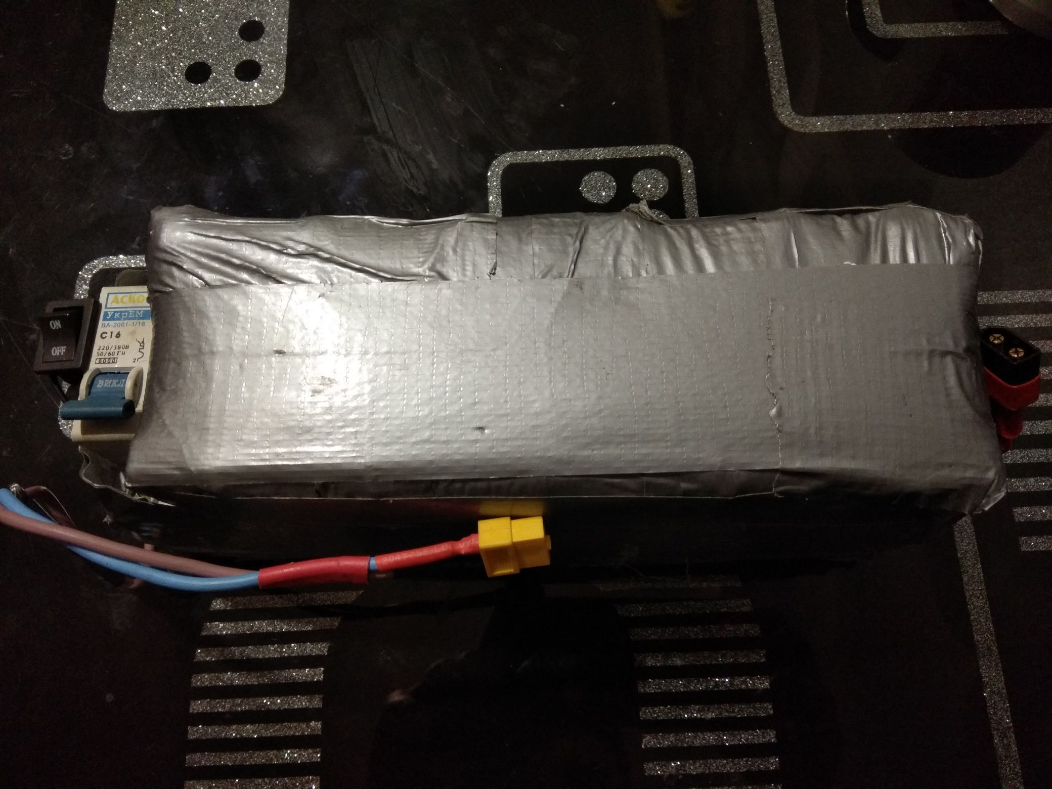 Установлена bms с модернизацией (установил дополнительно датчик температуры на 65гр), по краям текстолитовые вставки и тонкая пенка, по бокам толстая 10-12мм автомобильная теплоизоляция. Все это замотано армированным скотчем. Разьемы XT60