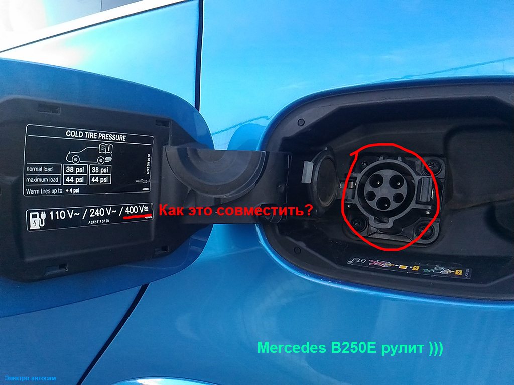 Увидел этот зарядный лючок Mercedes B250E на Электро-пати на вертолётной. В принципе, 3 провода на разъёме есть, так что трёхфазное напряжение подать можно :ugly: