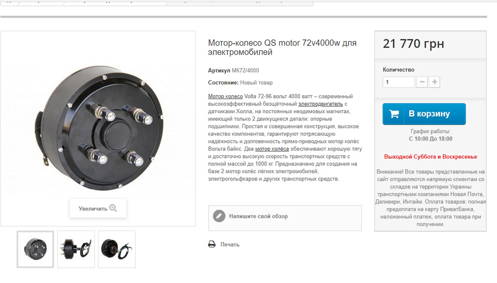 Навіть у нас,в Україні,продаються такі мотор-колеса потужністю 4000w за ціною 21770 грн за 1-е колесо. Його характеристики доволі непогані і продавець описує що два таких колеса дадуть можливість високої швидкісті автівки з повною масою до 1000 кг.
