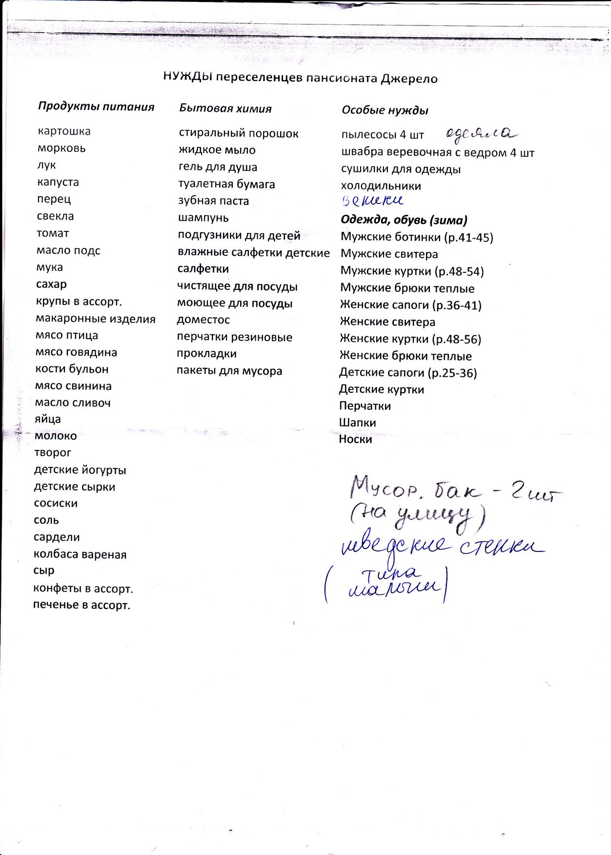выкладываю скан о текущих потребностях,в столбике "особые нужды"-это секонд хенд,вещи может у кого завалялись,бывает и не нужно уже,поскольку приобретены новые,продать сложно,а выбросить жалко.К примеры пылесос,холодильник может уже не нужен,одежда,шведские стенки и прочее.
