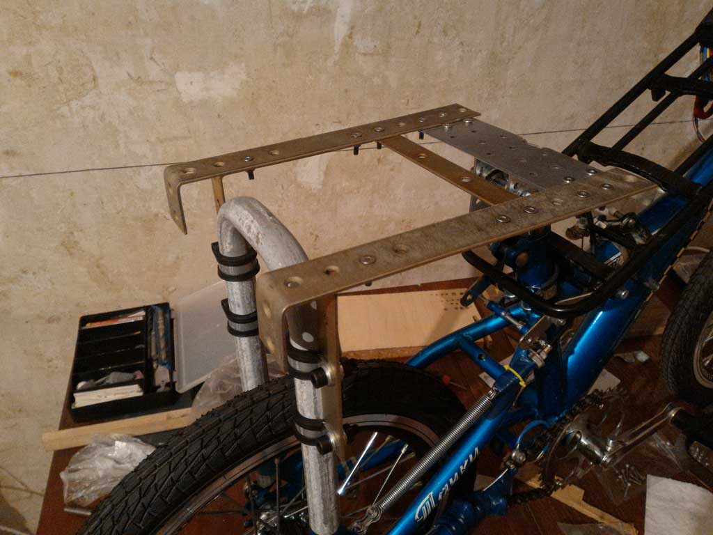 Новые колеса спицевал из отдельно купленных деталей - алюминиевые 16-дюймовые обода, спицы толщиной 2,6мм. Поставил спереди 350-ваттный редукторный мини-мотор (снял со своего предыдущего электровелосипеда, так что, тут было без выбора). Кстати, из всех колес, которые я когда-либо спицевал, это набрать было сложнее всего. Батарея литий-ионная - 14-баночная сборка из 18650 на 10Ач, лежит в сумке на багажнике над рамой. Контроллер - 6-мосфетный Infineon, прошитый на минимальные настройки.