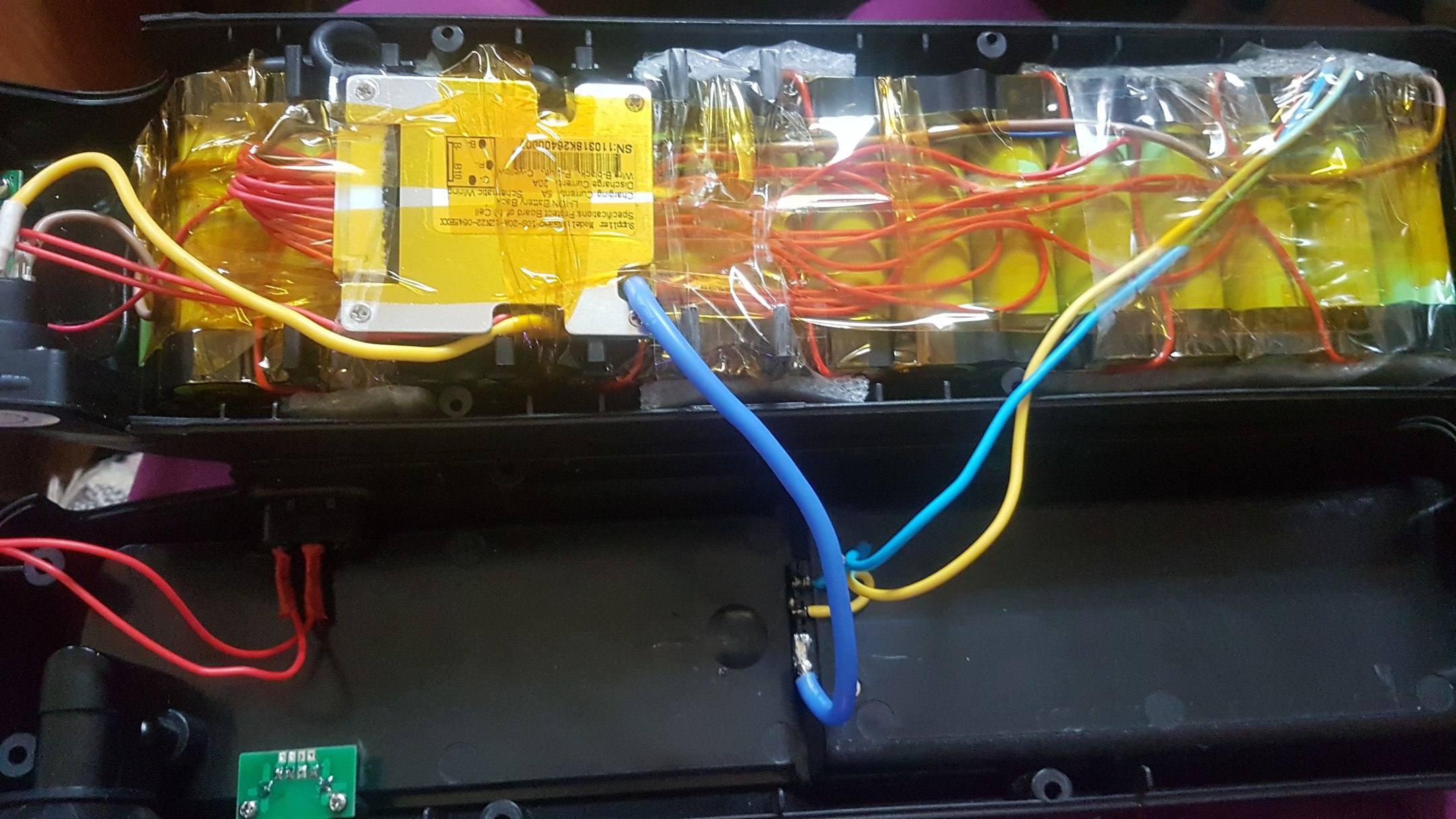 Термоклея у меня никогда и не было. Максимум - несколько слоев изоленты могу наложить. Но это уже потом. Сейчас буду катать. Если отключу ваттметр - он собьется попросту (сегодня я подумал, что он вообще помер - из-за того, что при выключении бмс на выходе 20 с чем-то вольт, он просто завис, кЕтайское Г). По расчетной ёмкости 17ач должно выйти (2850мач, 6s) и выкатывать теперь два-три дня. После отпишусь как вышло. После первого вечера езды кажется, что чуточку повысилась максималка на этой батарее. Надо будет потом еще и провод на раме укоротить до приемлемой длины, а то там тоже падает до пару вольт под нагрузкой. Раньше и не замечал этого без вольтметра (пару дней только как поменял старую ручку газа). Могу написать про переделку ручки газа, если будет интересно.