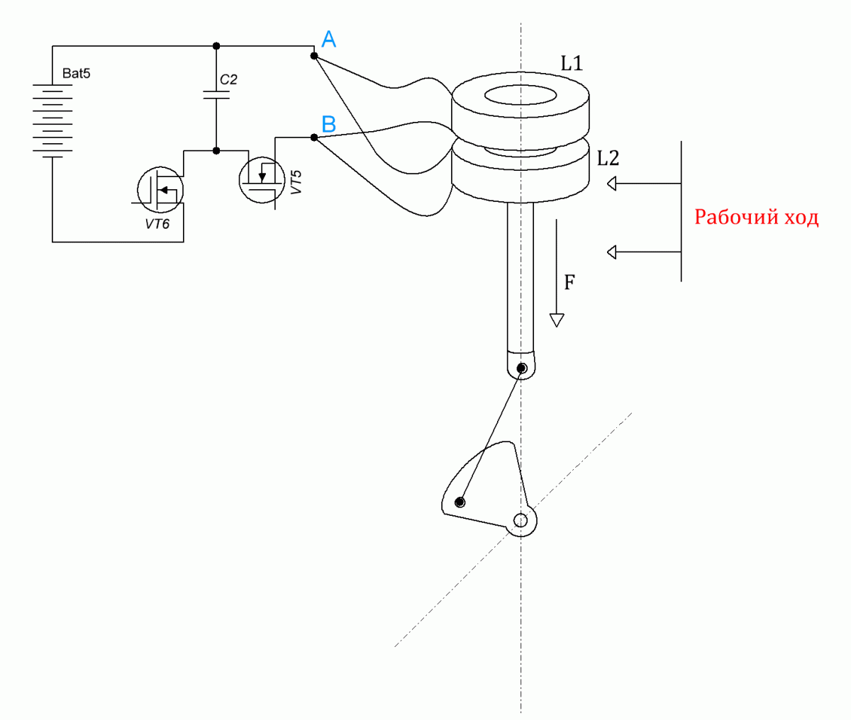 Ниже приведены три рисунка, импульсного поршневого электромагнитного двигателя, так как более естественным и простым для понимания является прямолинейное движение при отталкивании э.магнитов: Первый рисунок - это ИПЭД работающий на притягивание. Он состоит из рабочей катушки индуктивности L1, которая жестко фиксирована по отношению к поршню-ферромагнитному стержню. Ферромагнитный стрежень в свою очередь представляет из себя аналог поршня в ДВЗ, и может смещаться по направлению силы F. Поршень связан с кривошипным маховиком, который уже преобразует поступательное движение в вращательное. На рисунке отображен условный рабочий ход. Момент времени когда ключ VT1 замыкает катушку L1 на источник BAT1 соответствует положению нижней точки рабочего хода поршня 1. Момент выключения ключа VT1 соответствует верхней точке рабочего хода поршня. При этом катушка индуктивности в данном случае для схемы управления представляет из себя обычный дроссель, который в прямом ходе "накапливает" энергию, а в обратном - возвращает в виде индуктивного броска, с одной лишь тонкостью - что смещение ферромагнитного поршня вызывает модуляцию параметра индуктивности катушки в каких то пределах. Преимущество такого ИПЭД в том что он относительно прост в реализации по отношению к остальным моделям ИПЭД. Недостаток такой системы заключается в том что магнитный поток взаимодействующий с поршнем создается тогда - когда поршень относительно далеко от источника этого потока, а как мы знаем, интенсивность магнитного потока убывает на квадрат расстояния, то и есть словами простых смертных - к катушке прилаживается напряжение тогда - когда то - с чем она должна взаимодействовать - далеко - по этому взаимодействие слабо и не эффективно ( относительно ) . На втором рисунке представлен схемотехнически ИПЭД работающий на отталкивание... Фактически, как то видно из рисунка - ничего не изменилось, за исключением того - что на место поршня установлена вторая катушка, таким образом блок такого двигателя содержит уже две катушки L1 и L2. Отличие такого ИПЭД от предыдущего кроется не только в его конструкции но и в временной диаграмме, а именно рабочий цикл ( момент подачи тока ) начинается тогда когда подвижная катушка L2 находится в верхней точке рабочего хода, что соответствует минимальному расстоянию между взаимодействующими катушками - как результат высокая эффективность формирования механического усилия, собственно это и является преимуществом такой системы. Из основных недостатков можно обозначить сложность конструкции ( например все силовые узлы должны быть выполнены с учетом взаимодействия этих узлов и электромагнитного узла). Есть еще одна тонкость связанная с работой ИПЭД, заключается она в том что электромагнитную систему можно запускать в резонансном режиме - а именно форсировать скорость электромагнитного взаимодействия. Пример такой реализации представлен на третьем рисунке. В чем фишка такого метода ? вопрос "коварен" .. по сейму мое ИМХО - фишка в том что в резонансном режиме скорость изменения тока di/dt, на определенных временных участках в индуктивной цепи может превышать скорость изменения тока в этой же цепи в не резонансном режиме. А как Мы знаем - именно скорость изменения тока в индуктивной цепи определяет "силу" магнитного взаимодействия между это
