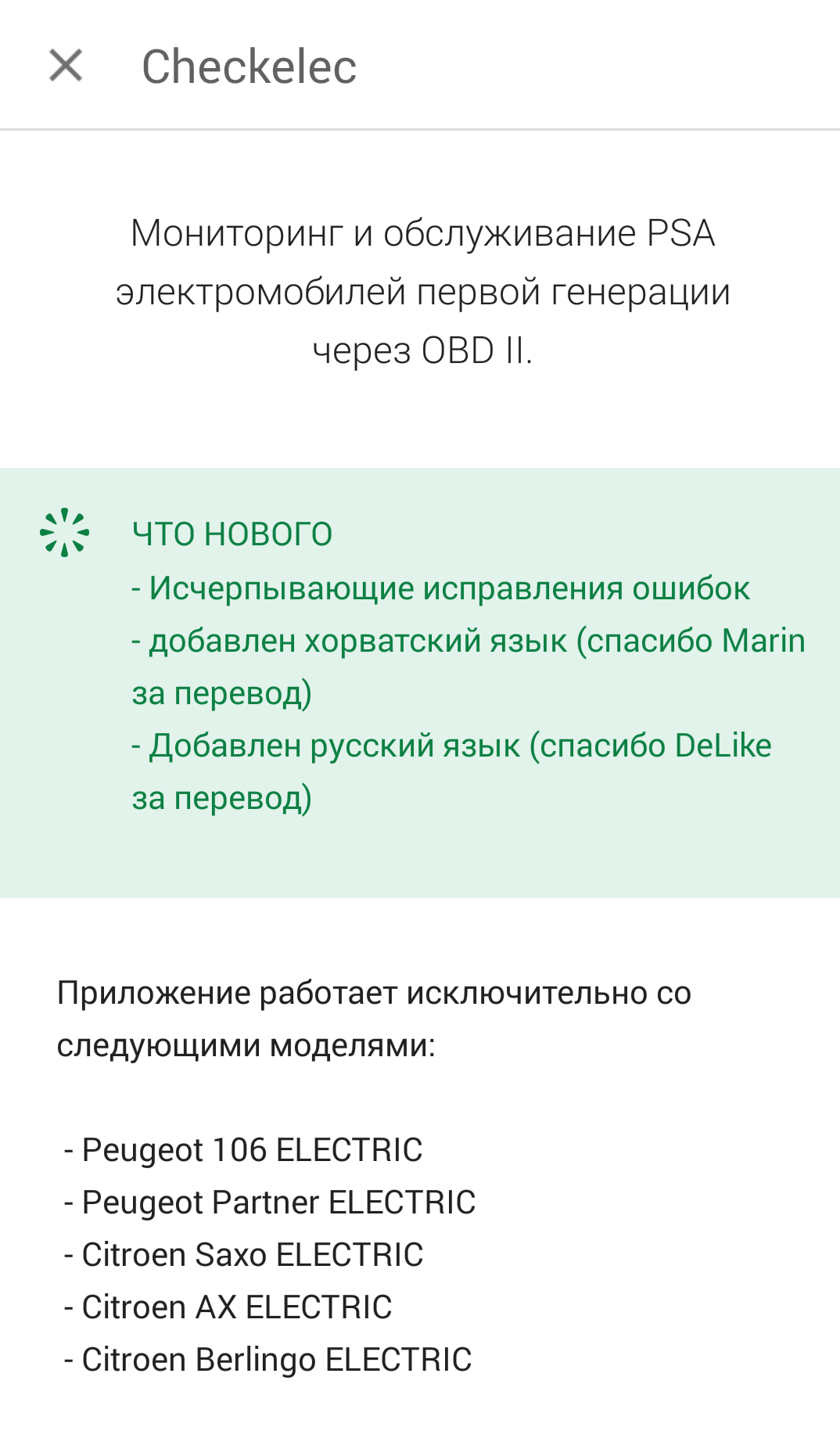 :idee: Протоколы связи PSA и Renault очень похожи, поэтому у меня есть проект по расширению приложения к электромобилям Renault. На самом деле, я жду некоторых данных от водителя Renault Electric Clio. Так что это займет некоторое время, но, возможно, в ближайшие месяцы я смогу это сделать. Я также могу взглянуть на возможность расширения приложения Checkelec на транспортных средствах «Th!Nk City»