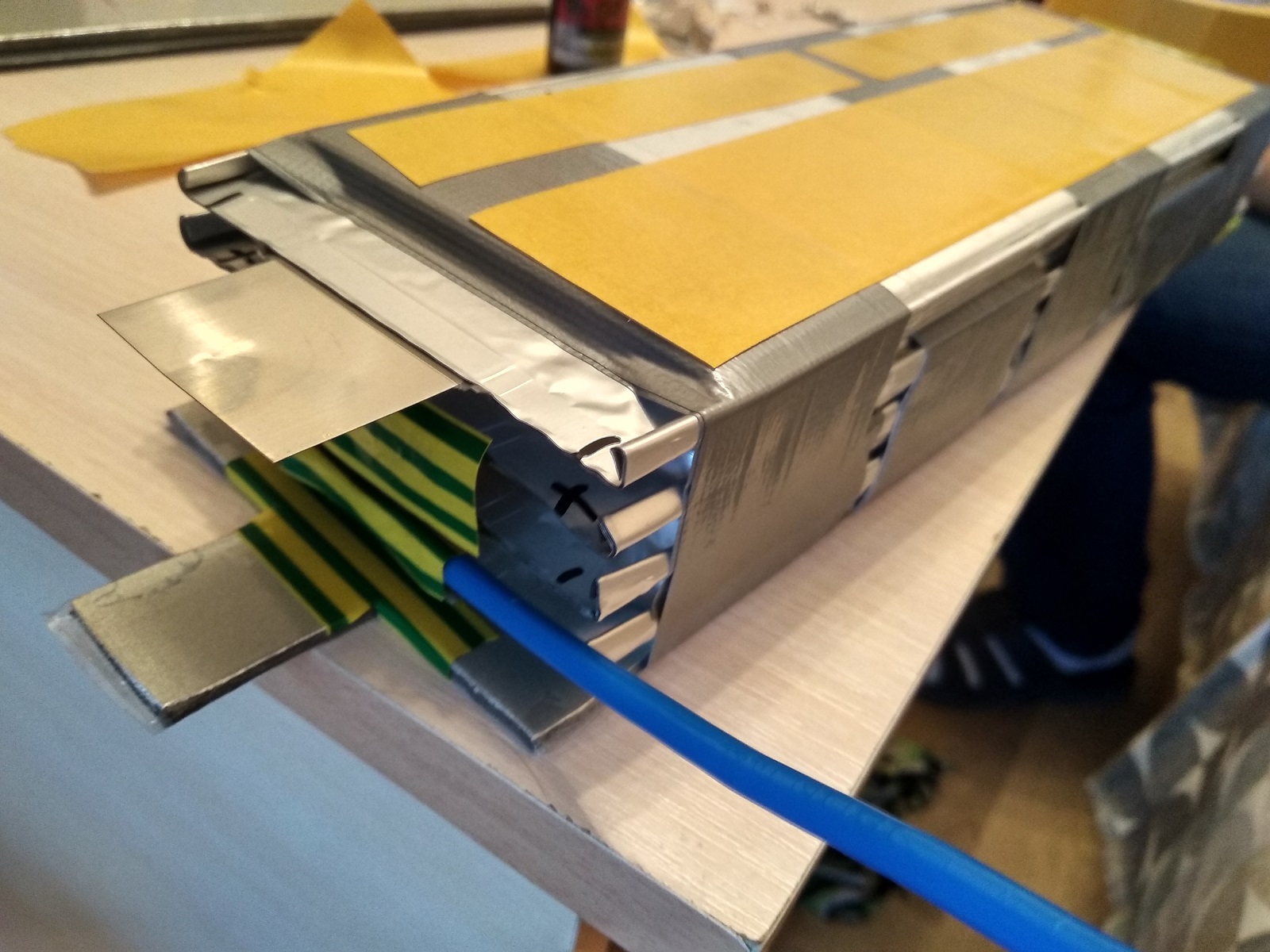 В угоду надежности сборки решили делать акум неразборный. Тоесть скотчи, двухсторонные и армированный... Классика. Жестким материалом по краям и перемычки между 4-мя пакетами делались из композитного материала Alukobest (алюминий-пластик-алюминий). Получается низкий вес, и хорошая жесткость.