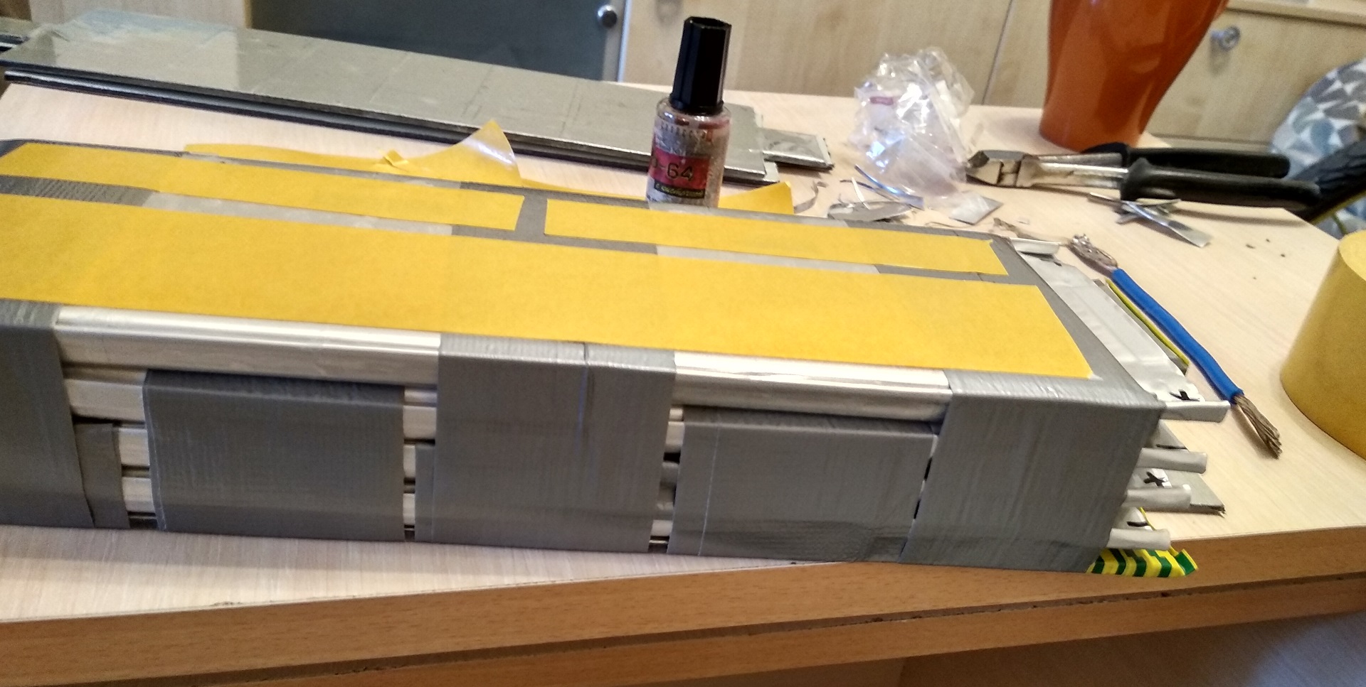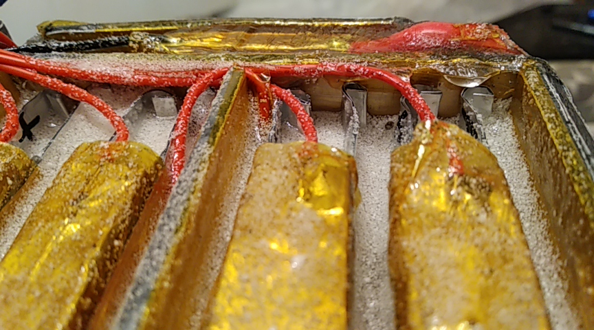 В угоду надежности сборки решили делать акум неразборный. Тоесть скотчи, двухсторонные и армированный... Классика. Жестким материалом по краям и перемычки между 4-мя пакетами делались из композитного материала Alukobest (алюминий-пластик-алюминий). Получается низкий вес, и хорошая жесткость.