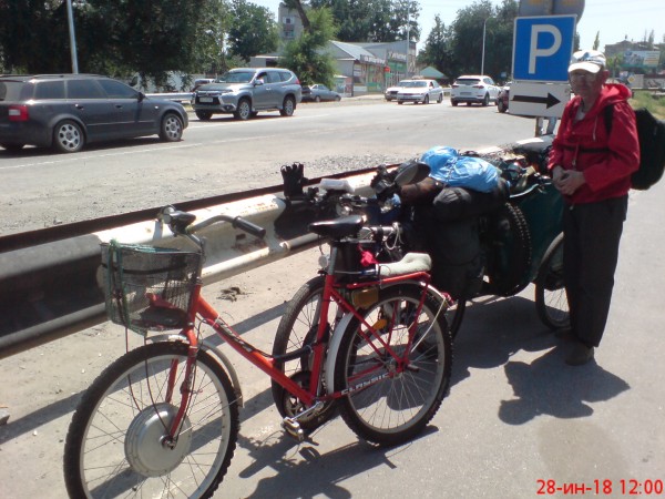 Итак, выскочил сегодня по делам и вижу такой аппарат! Дядька неразговорчивый, если бы я подъехал не на электровеле - может быть и не разговорил бы вообще! Держит путь из Херсона в Монголию! Говорит что не в первой. Уже были трипы Херсон-РБ-Херсон и Херсон-Европа_херсон. Движок точь-в-точь как у меня электра 500Вт, но сзади стоит еще один - вроде как не подключен для экономии, резервный. так сказать... Батарейка 44Ач, по европейским дорогам вполне хватало на 150км, сейчас по нашим буеракам рассчитывает на 100-110км. Заряжается на заправках, говорит что 44Ач заряжает на 100% менее чем за 3ч. Спит в палатке.