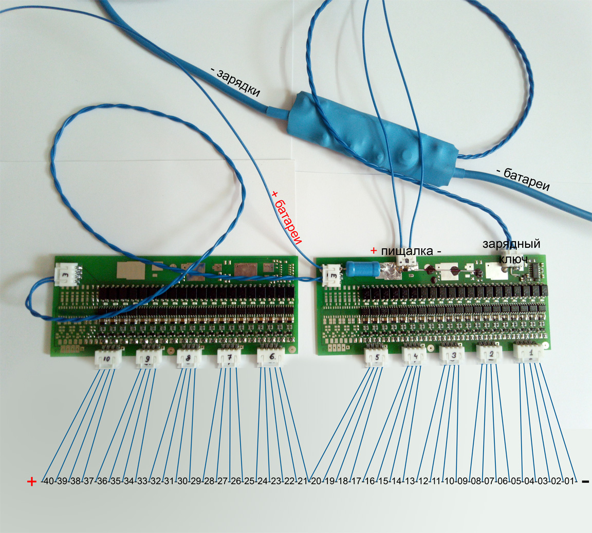 Если будет использоваться, скажем, только 18 каналов первой платы, то и с 18-м каналом соотвественно, а два последний не задействовать, заизолирував или вынув из разьема.- плюс (тоненький) и минус (толстый) должны быть напрямую без разрыва соединены с батареей, а разьем "с" комутатора соединен с платой.