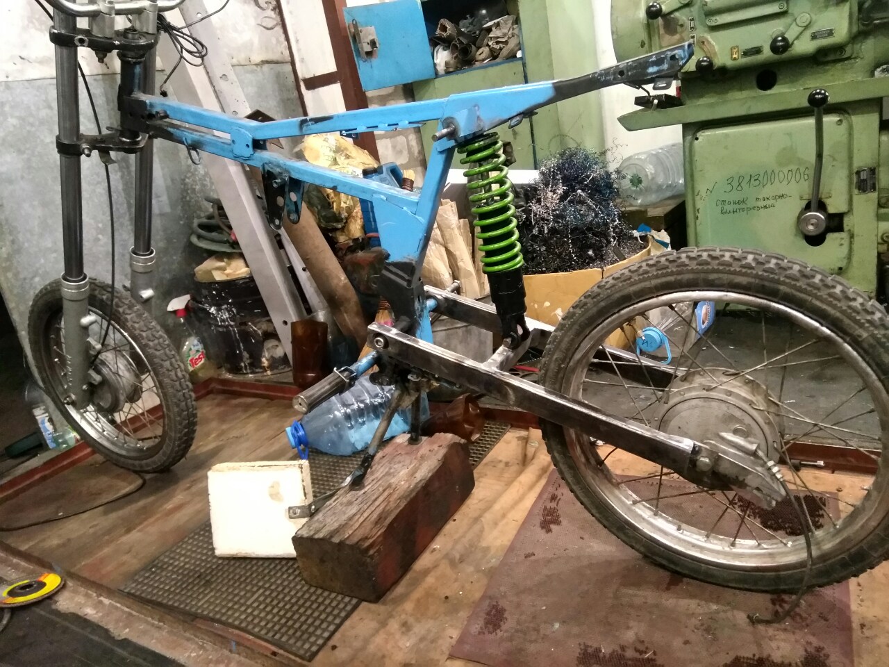 Рама там ещё не тронутая, шильдик присутствует) ну и колеса родные. Но раму прийдётся изменять сильно. Доварил маятник, пожмякал подвеску - под моим весом проседает примерно на 30%, получилось довольно длинноходная подвеска. Амортизатор конечно туповат, в плане стронуть его сложно, и масло надо более жидкое. Но все-равно это гораздо лучше того что было.