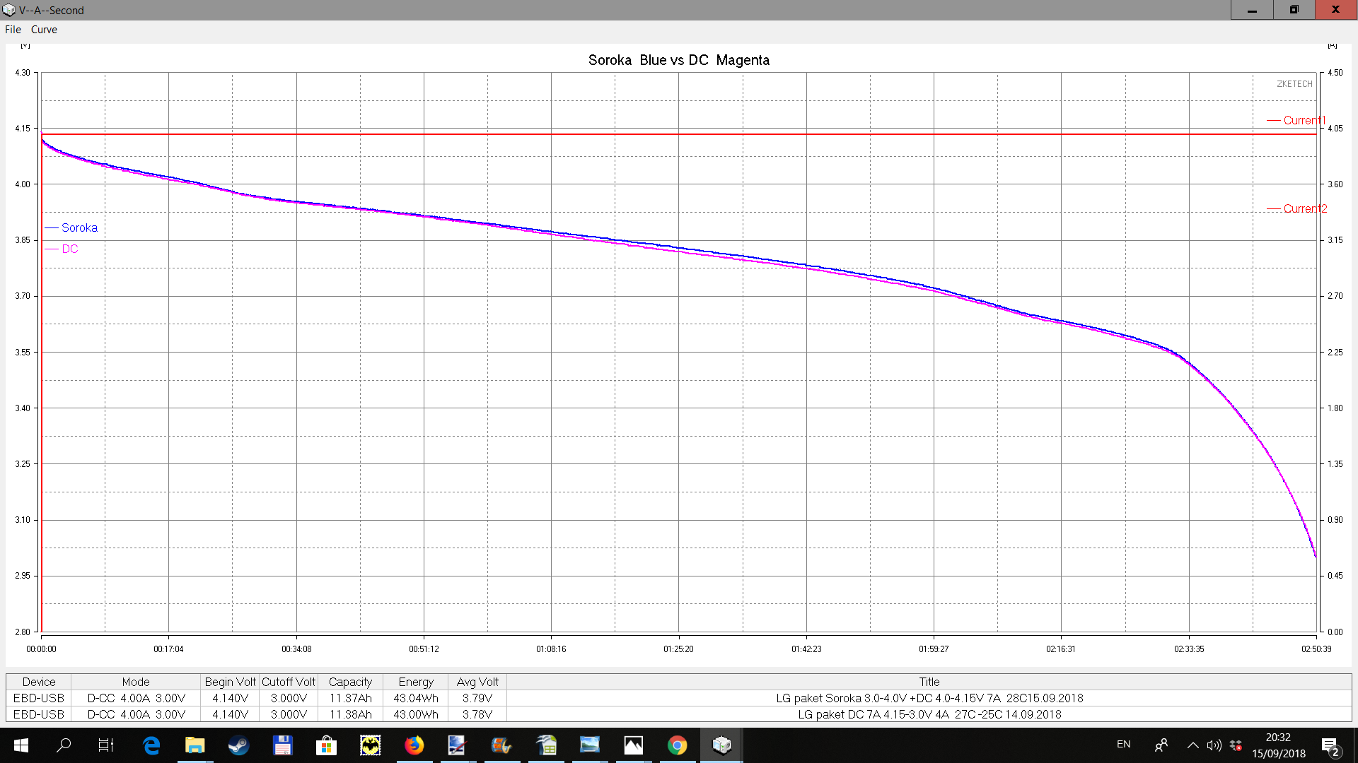 И 2 графика. Пакет заряженный DC и после полноценного заряда зарядным Сороки. Контакты при разряде ДС были длиннее, поэтому этот график для примерного сравнения.