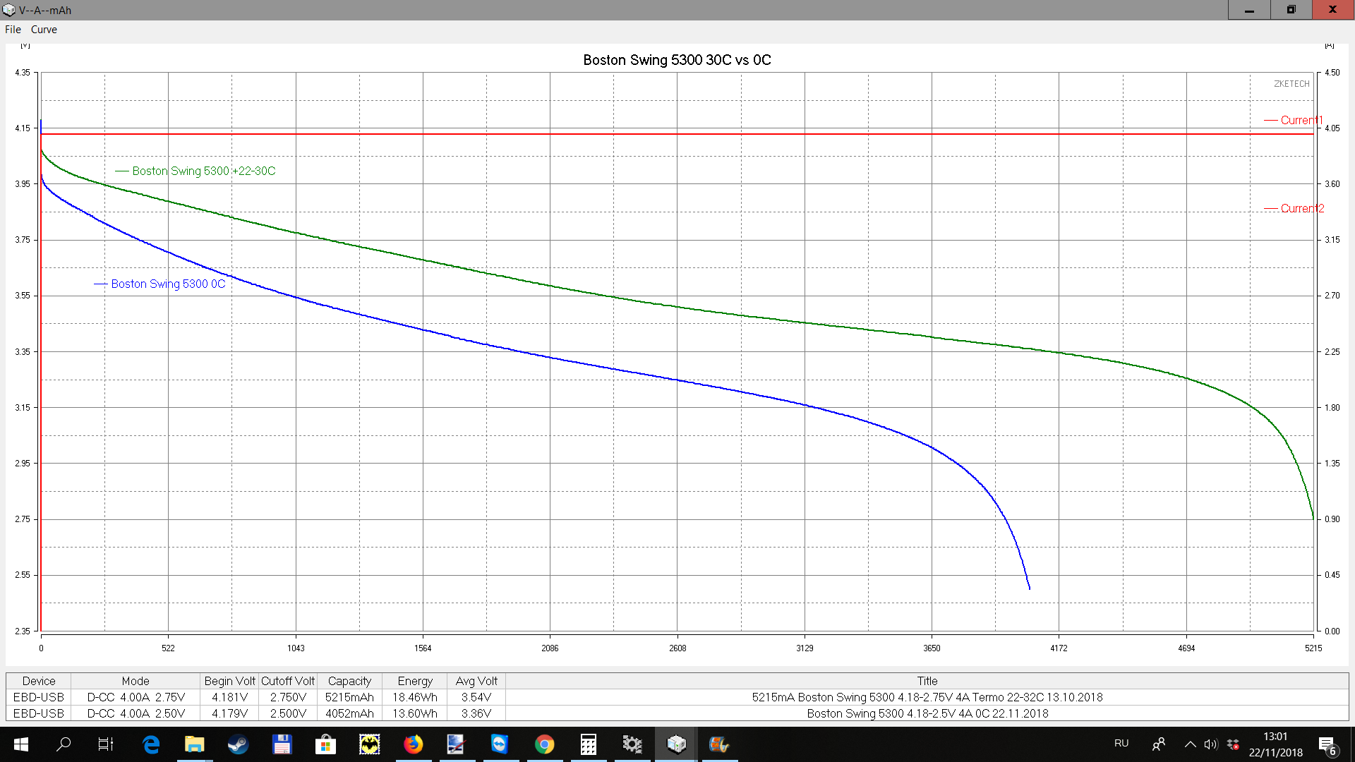 Полноценного теста при -15С не получилось. Температура быстро поднялась до 0 градусов и такой оставалась до полного заряда. При токе 2,6А и нулевой температуре аккумулятор Boston Swing 5300 в себя взял 5100мА