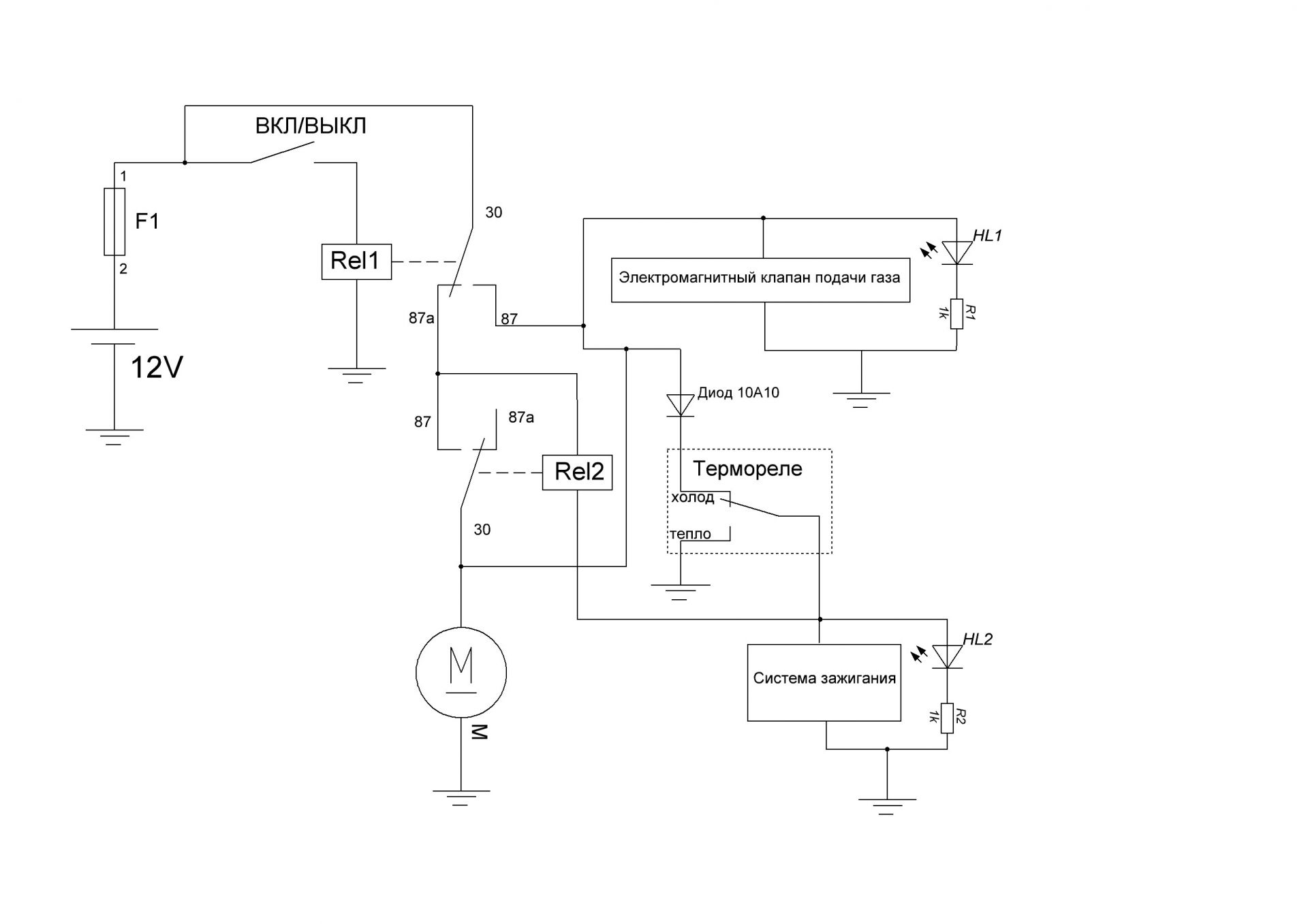 Реле1, запускается вентилятор, электромагнитный клапан подачи газа, и система зажигания, через холодное термореле. Светодиодные индикаторы указывают на работу системы зажигания и электромагнитного клапана.