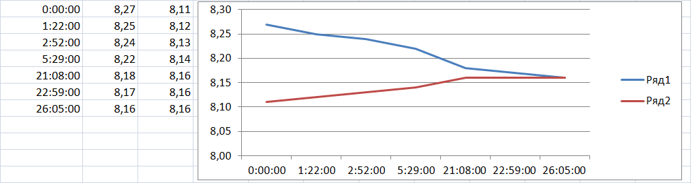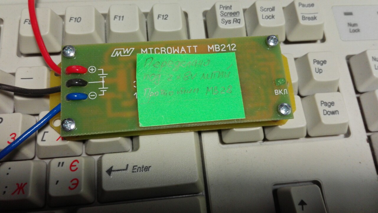 Напряжения на силовых выводах 8.27 В и 8.11 В. Напряжения между силовыми выводами и средней точкой в каждой консерве были равны и соответствовали половине напряжения между силовыми выводами. Температура окружающей среды колебалась от +25 в начале испытания до +1 в конце испытания. Полный баланс на силовых выводах консерв был достигнут через 26ч. Далее напряжение снижалось одинаково на всех ячейках батареи, без разбаланса. Испытания были прерваны через 2000 часов, после достижения баланса, при напряжении ячеек 2.99 В, так как балансир не отключился по нижнему порогу напряжения. Скорее всего в балансире предусмотрен слишком низкий для данного типа батарей порог отключения. Это прототип переделанный из балансира для 12В аккумуляторов.