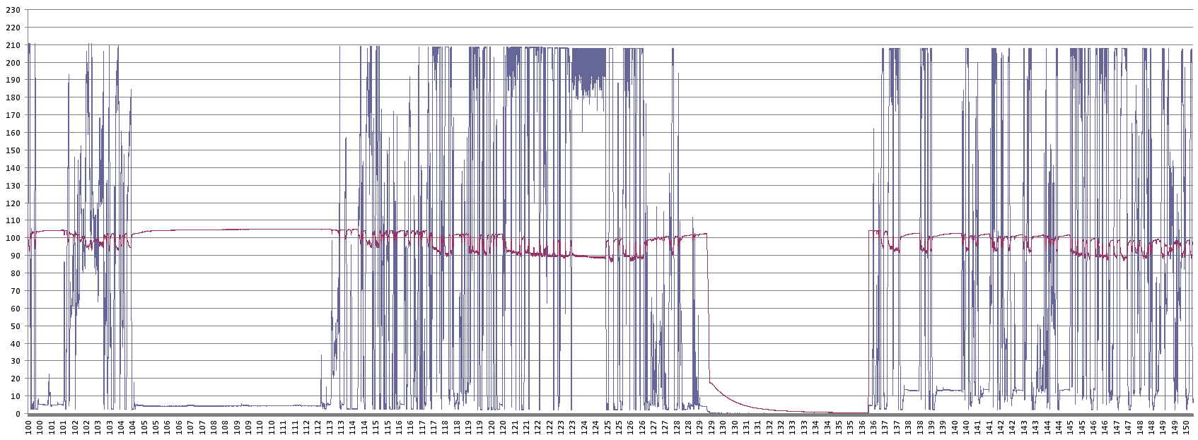 Это модель езды такси. Так сказать без какой-либо экономии. По ней можете определить период разгона и торможения. Синяя - ток, красная - напряжение. По абсциссе минуты.