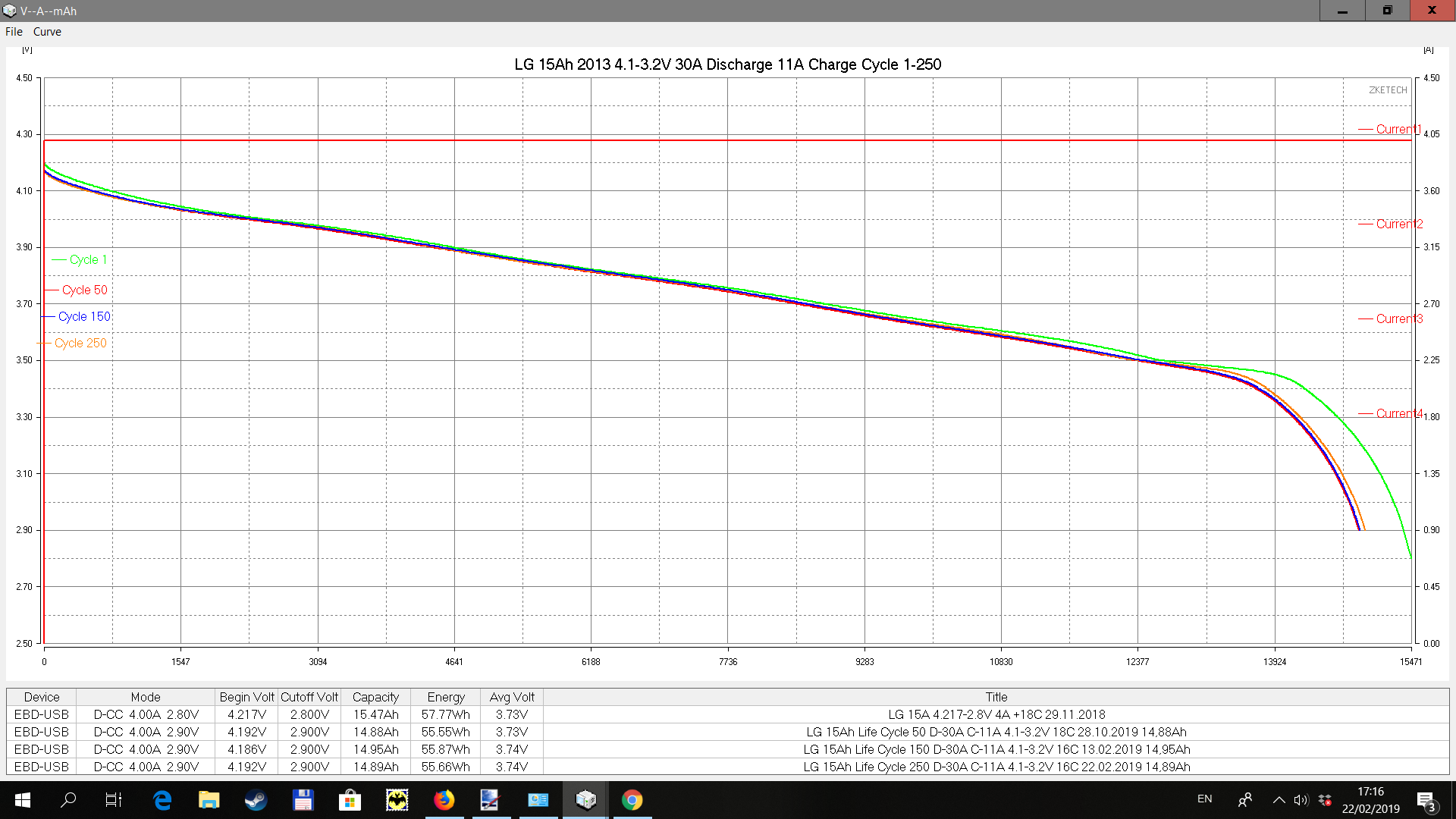 График разряда. После 150 циклов емкость даже немного возрасла. Связываю,это с потеплением в комнате на пару градусов.