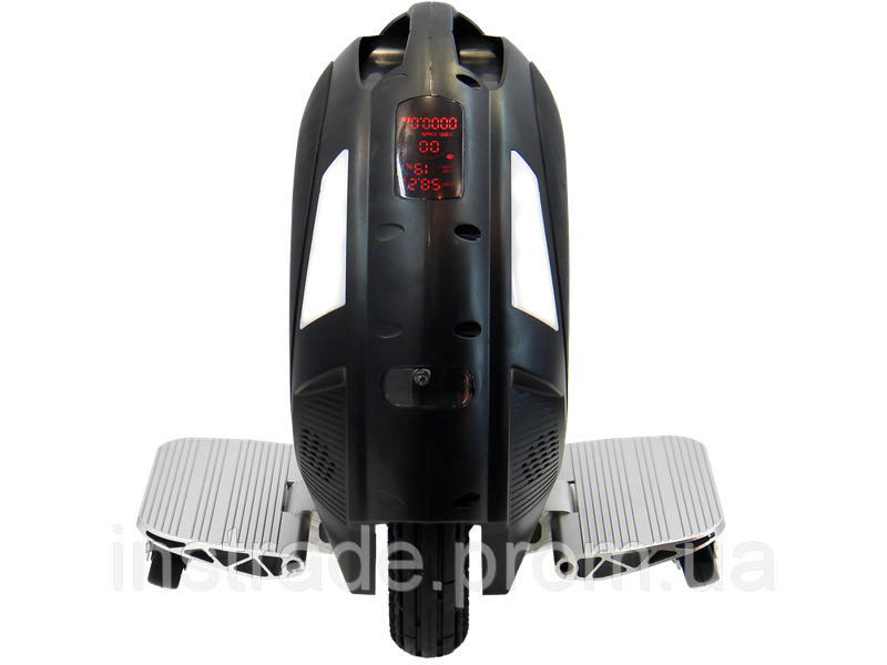 На нем отображаются вольтаж, скорость (вокруг скорости аналоговая шкала из загорающихся светодиодов от 0 до 30 км/ч ), общий пробег, процент заряда. Причем его прекрасно видно стоя на колесе, сначала кажется что он расположен вверх ногами, но именно вверх ногами на него смотрит пилот, так что тут все продумано.