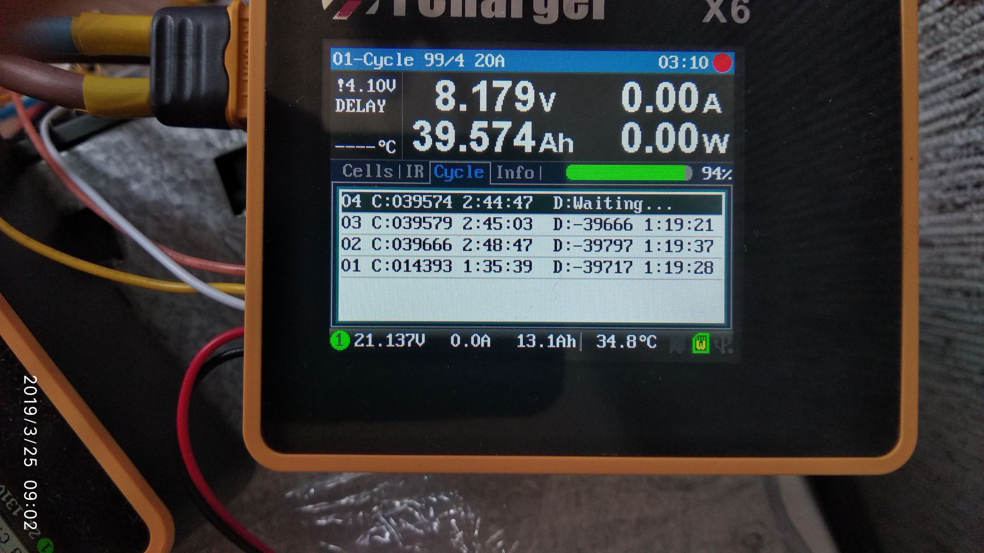 В конце заряда контролировал напряжение, что бы не было сильно опережающих. Когда ток упал до 2-3А, соединил консервы параллельно что-бы отбалансировались и добил напряжение до 4,15В