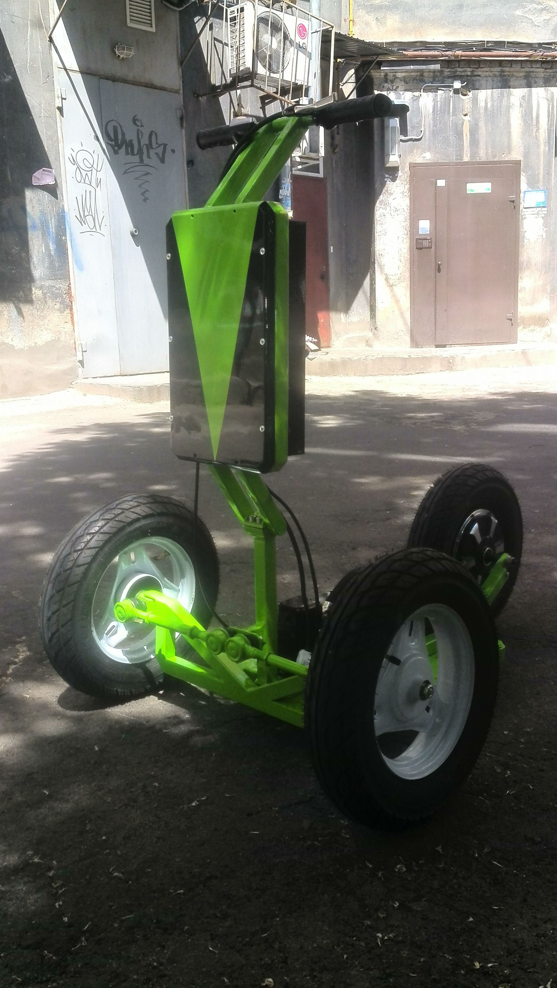 Технические характеристики: длина 2200 мм, масса 77 кг, мощность двигателя 1000 вт, напряжение 60 вольт, крейсерская скорость 42 км/ч, максимальная скорость 60 км/ч. Пробег на одной зарядке 40 км. Батарея 60 вольт 12 а/ч, гелевая. Пробег на сегодняшний день 12000 км. Вложения в аппарат за время пробега 0 грн. Себестоимость изготоаления 900 долларов.