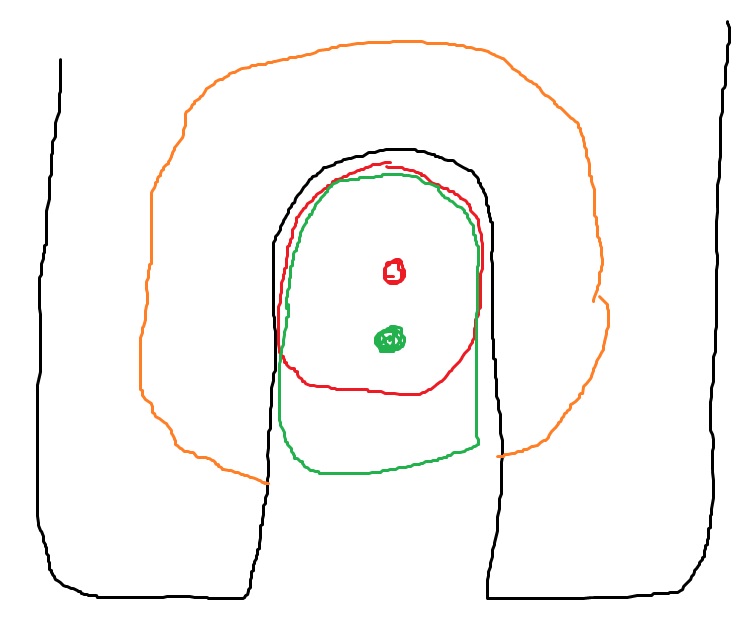 Красным цветом показана обычная велоось с её центром, а зеленым ось бОльшего диаметра обычного моторколеса с фрезеровками по бокам что бы влезало в обычные дропауты. А оранжевым цветом показано углубление в дропаутах под гайку. Поскольку центр у оси МК смещен вниз, то гайка в углубление не ложится, приходится заказывать толстую шайбу со смещенным отверстием под размер оси моторколеса, с ней все ложится без перекосов ровно по плоскостям, что при затяжке гаек сводит к минимуму статические перенапряжения в металле дропаутов. Некоторые обходятся без вычурных шайб, просто подымают вход оси выше при помощи круглого напильника, но мне идея пилить дропы под мотор как то не очень.