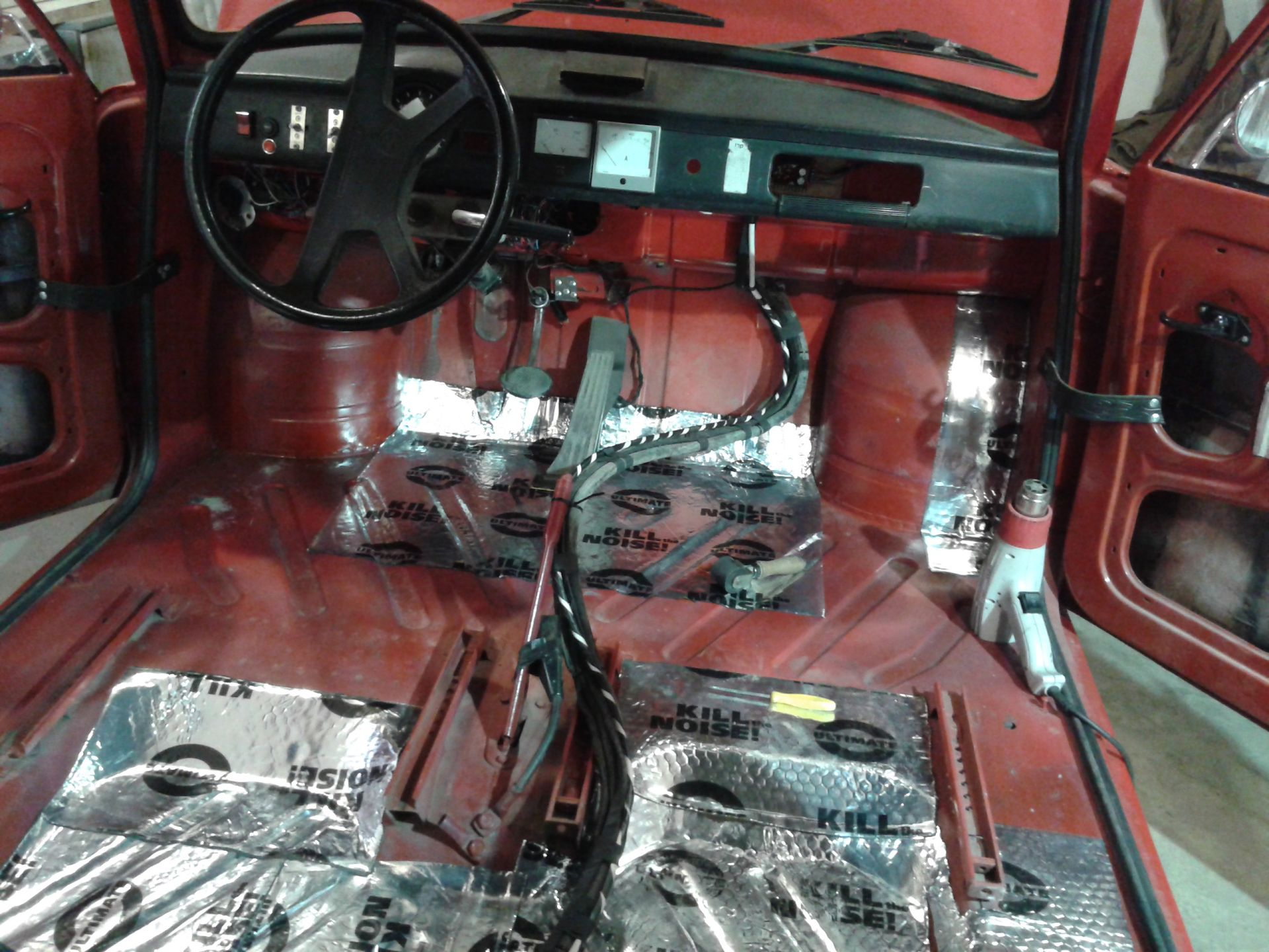 Сегодня продолжаю борьбу с вибрацией.... процесс не быстрый, если качественно выкатывать воздушные пузыри. Затянул цельный лист вибры под педаль газа и на моторный щит. В планах затянуть все арки и днище.