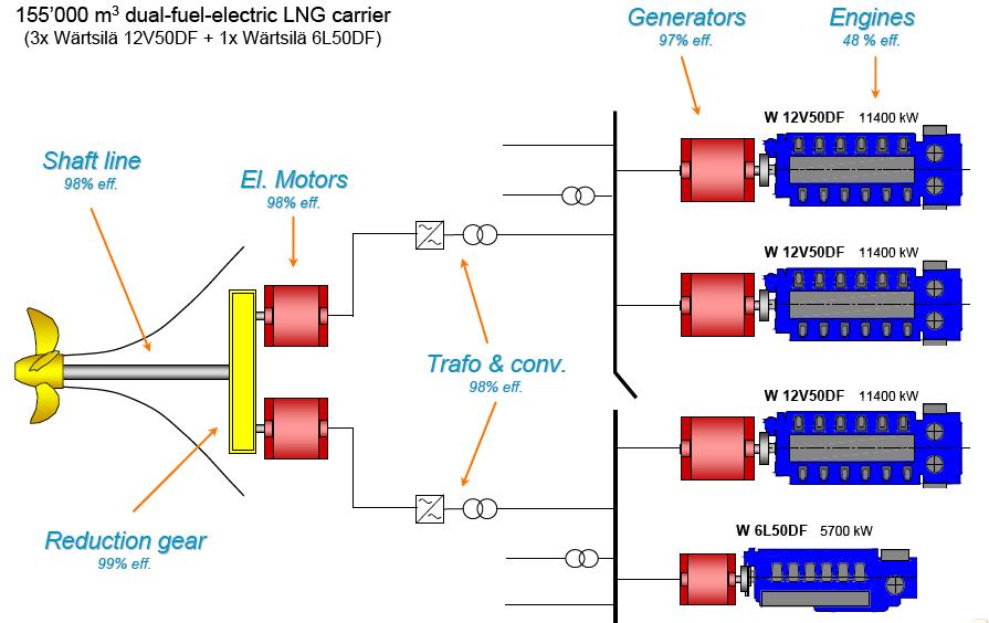Насколько кто портит экологию помогает понять величины кпд цепочек преобразования энергии из одной формы в другую. Участники форумов и блогов активно манипулируют этими показателями, перемещая чашу весов и в одну и в другую сторону. Я нашел интересную презентацию - описание силовой установки французского газового танкера. Это тот, который перевозит сжиженный природный газ, который США стараются продать всем и Россия тем же путем идет. В целом все это позитивные пути, т.к. доставка газа таким транспортом делает рынок природного газа более сбалансированным и менее чувствительным к изменению логистики трубопроводного транспорта газа. Т.е. газовый танкер он современный (прошло несколько лет после постройки) и имеет передовую силовую установку. Интересно, что топливом для силовой установки является тот же метан. Силовая установка представляет собой несколько судовых двигателей, работающих параллельно на электрические генераторы, а те в свою очередь передают энергию на электромоторы и винты.