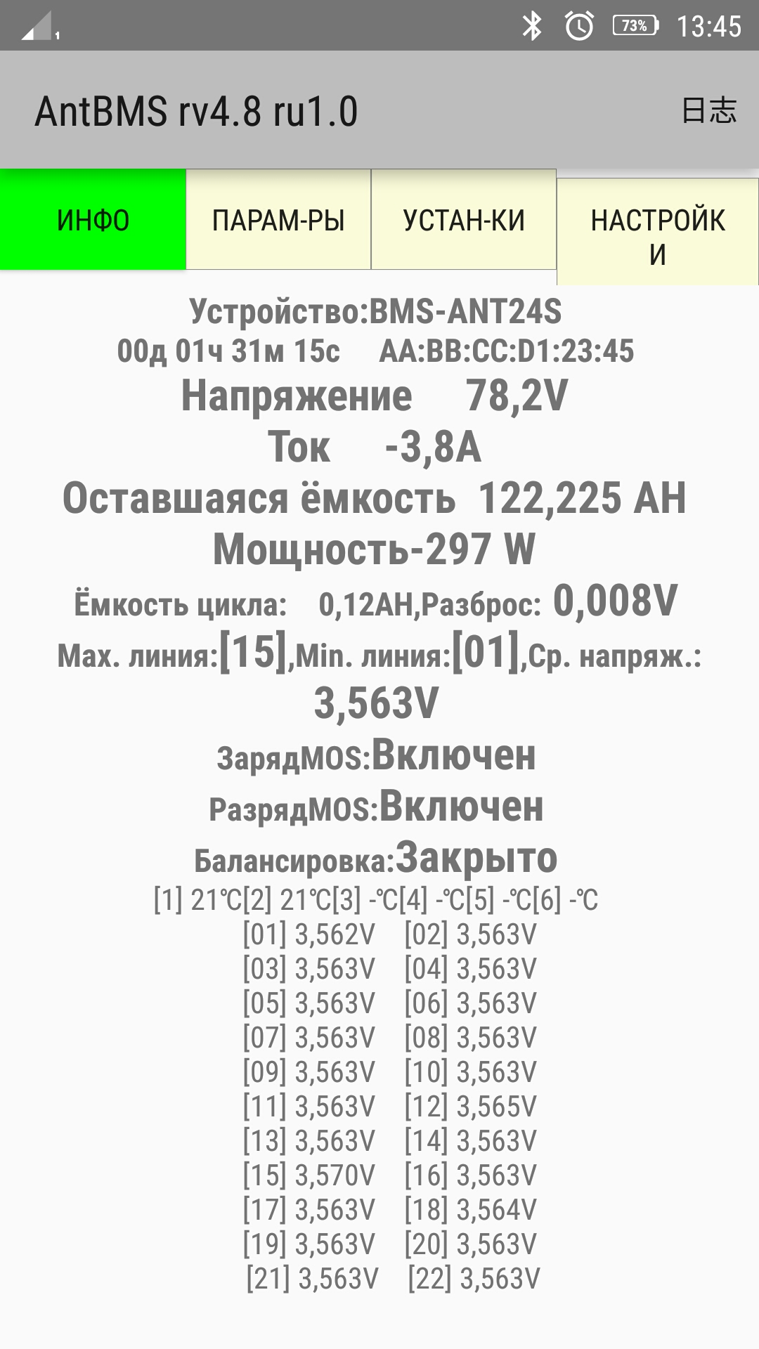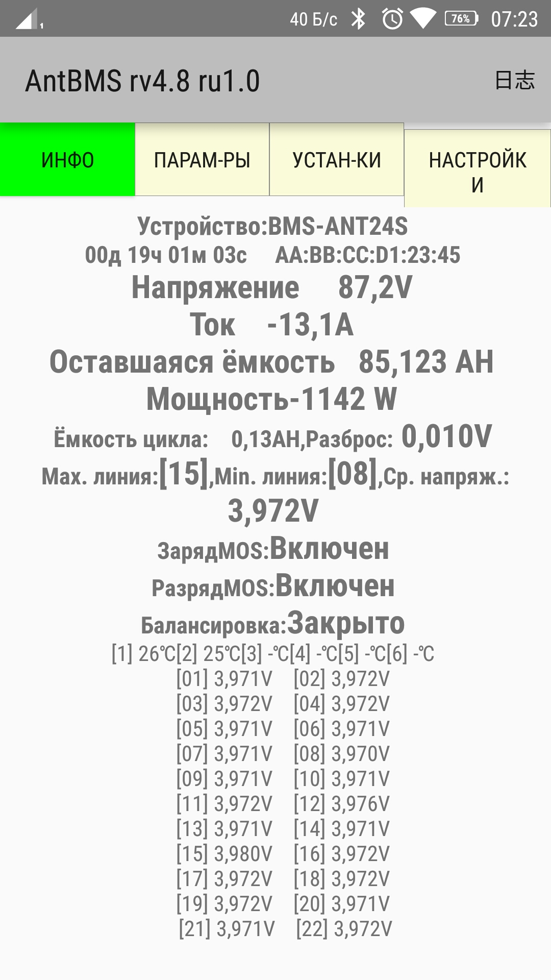 После успешной и тонкой настройки смарт бмс,занялся флетпаками .Подключил их последовательно 3 шт выставил напряжение 89в и попытался ними заряжать..Счастья были полные штаны.А когда ещё и по телефону через блютуз подключился,так вообще...пошел выпустил своё счастье полных штанов в местный туалет... :-D