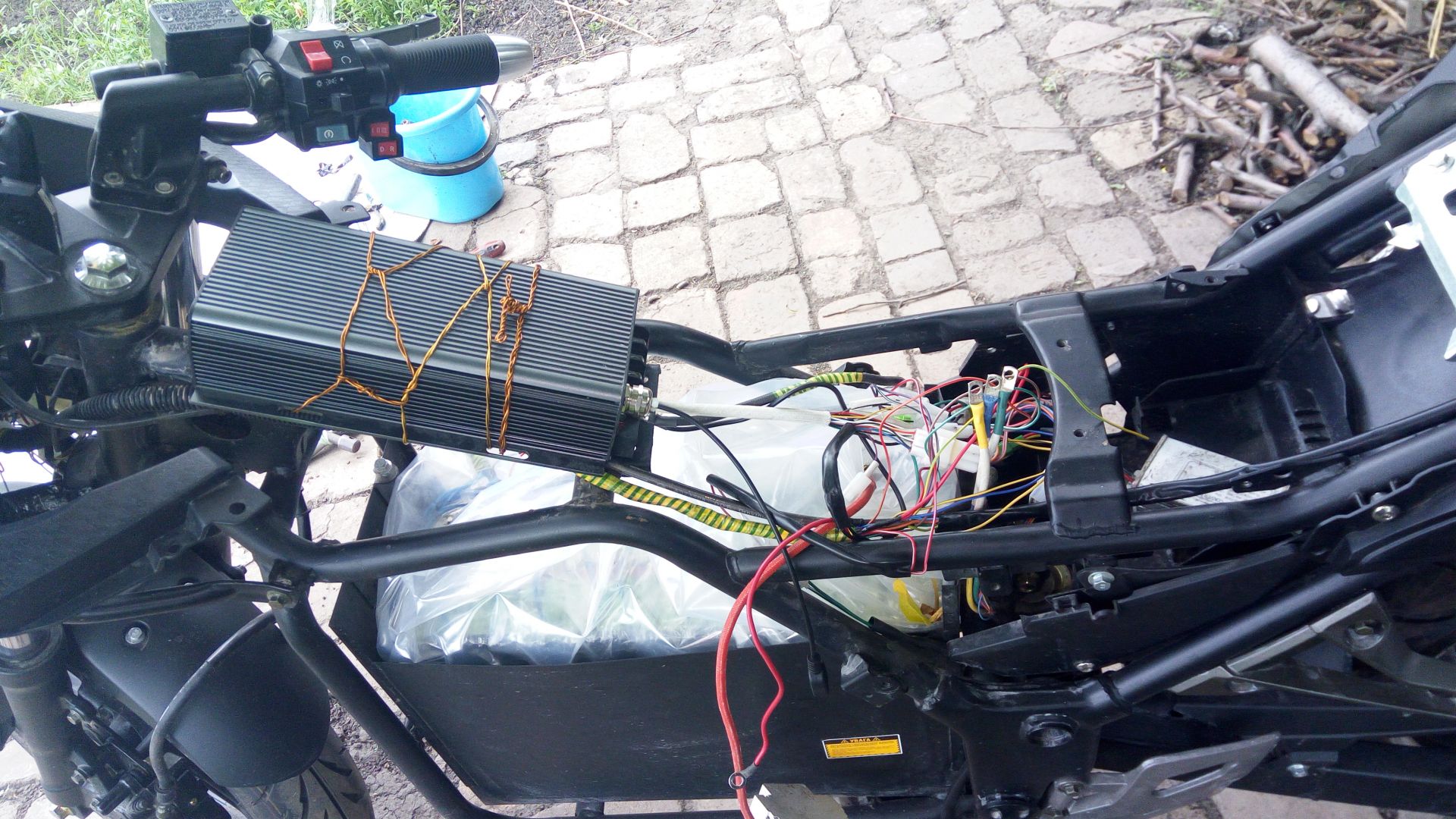 После сборки и настройки аккумуляторов ,зарядного и бмс,пришло время к контроллеру..(как раз весна пришла)..Заказывал на али, с блютуз адаптером...Хотя,сперва,решил прокатнуться на родном контроллере ,дабы потом сравнить разницу между обычным и синусным контроллером...Время поджимало,я был как раз в гостях у мамы( а мотык у неё все время стоял) ,у меня было всего лишь полдня подключить новый аккумулятор к старому контроллеру и поехать на нём в мой город Днепр...Итог, с великим трудом засунул аккумулятор (нужно было резать одну стенку), подключил и...... И я лечу ...........лечу на такси на электричку чтобы успеть в мой Днепр( B-)город за 200 км) так как родной контроллер напрочь отказался подавать признаки жизни... B-) :~-(