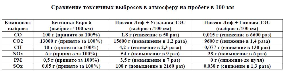 Я взял данные по нормативам евро 6, нормативам на выбросы газов ТЭС, типовые данные по выбросам вредных веществ на ТЭС с использованием газа и угля. Выкладками утомлять не буду, вместо этого я свел все в таблицу в которой значаться выбросы, выделяющиеся при пробеге в 100 км.