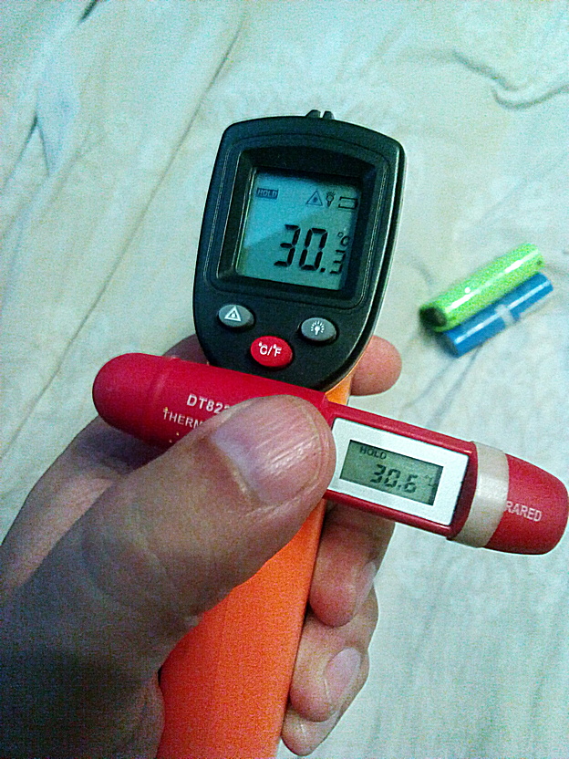 Вчера почитал все это, взял одну банку Boston Swing и одну LGDAS31865, первая с напряжением 4,00в, а вторая на тестере скачет с 4,11в до 4,12в. Потыкал в них двумя пирометрами, у меня жарко поэтому температура на пирометрах 30,6 и 30,3 градуса.