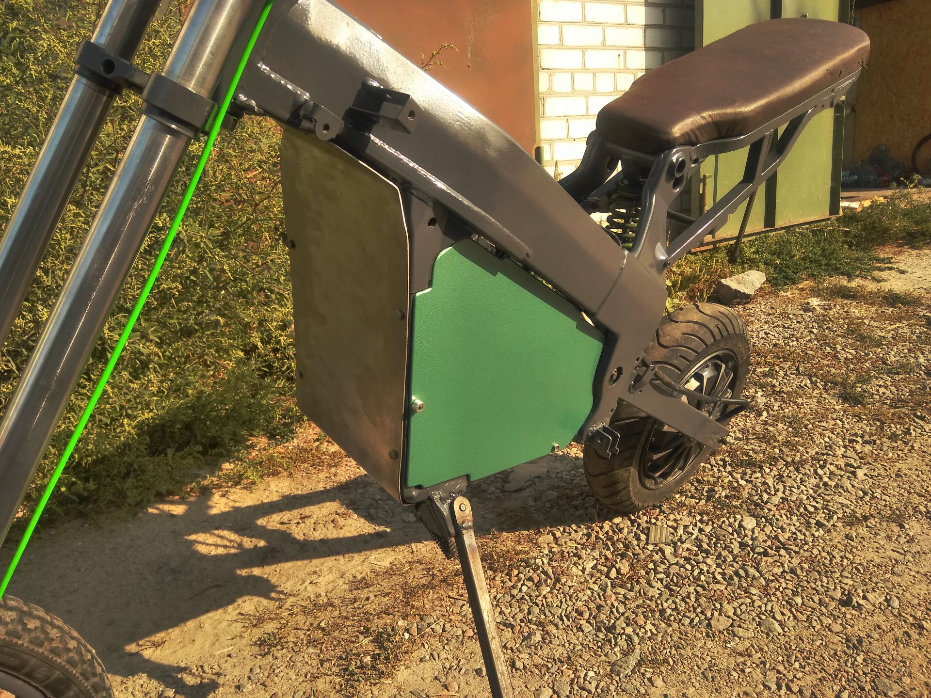 Сегодня были первые покатухи по городу. Точне первые были на прошлых выходных, но не было ещё зарядки, тормозил рекуперацией при отпускании газа и накатал всего 10км. Сейчас убрал плохие соединения в проводке, от батарейки идут провода на 25мм². Стоит один автомат на включение мозгов контроллера и от него резистор на заряд конденсаторов силовой части, на силовую часть отдельно автомат на 125А и один автомат на свет и ваттметр. Пока ещё обкатываю, выявляю основные косяки конструкции, что-то допиливаю. Потому и не покрашен. Вывел ещё кнопку на руль на включение рекуперации/тормоза и сделал чтоб он мог при отпускании ручки газа накатом идти.