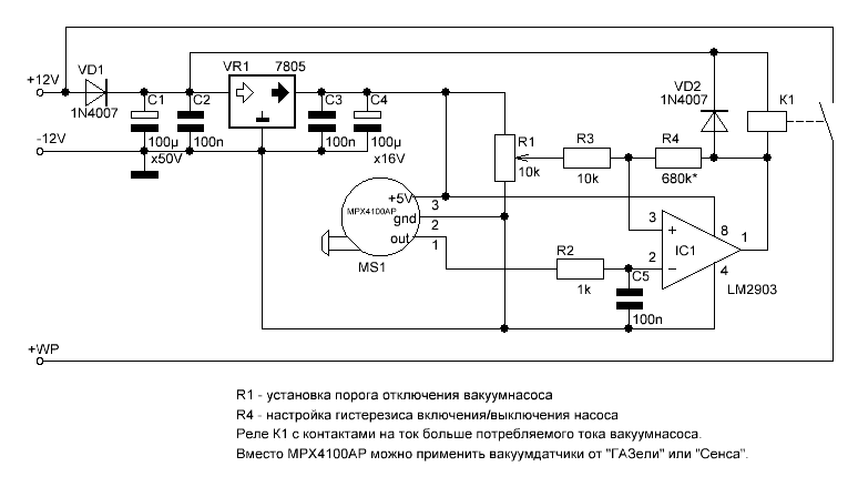 Вот схемка несложная "контроллера" для включения/выключения вакуумнасоса. Задаётся порог отключения насоса и гистерезис на включение насоса: