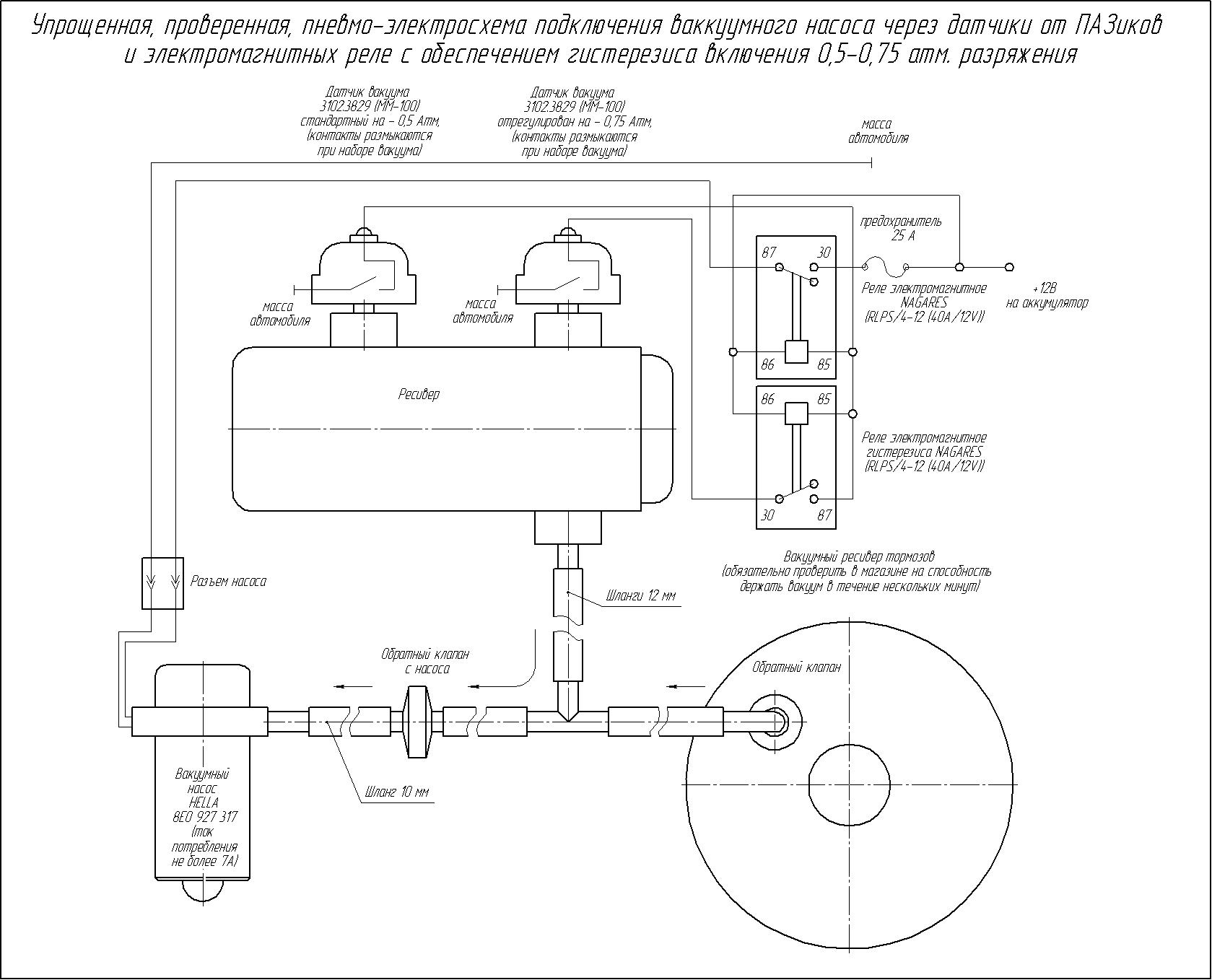 Удалил из схемы работы вакуумного насоса электронные компоненты, т.к. сгорело второе электронное реле. Перешел на релейно-контактную автоматику. Насос как на картинке, только не китайский, а немецкий б/у. Думаю китайский самое то. Насос включается чаще при периодических торможениях, если на педаль не нажимать, то раз в несколько минут. Вакуумник обязательно проверить даже новый в магазине на способность держать вакуум 0,8 атм. в течение нескольких минут до снижения до 0,5 атм. Буквально прийти с насосом и вакуомметром в магазин и там проверить, ну или с собой до машины донести, подключить шланг и вакуум не закрепляя вакуумник на машине. Многие новые вакуумники непонятного производства травят!