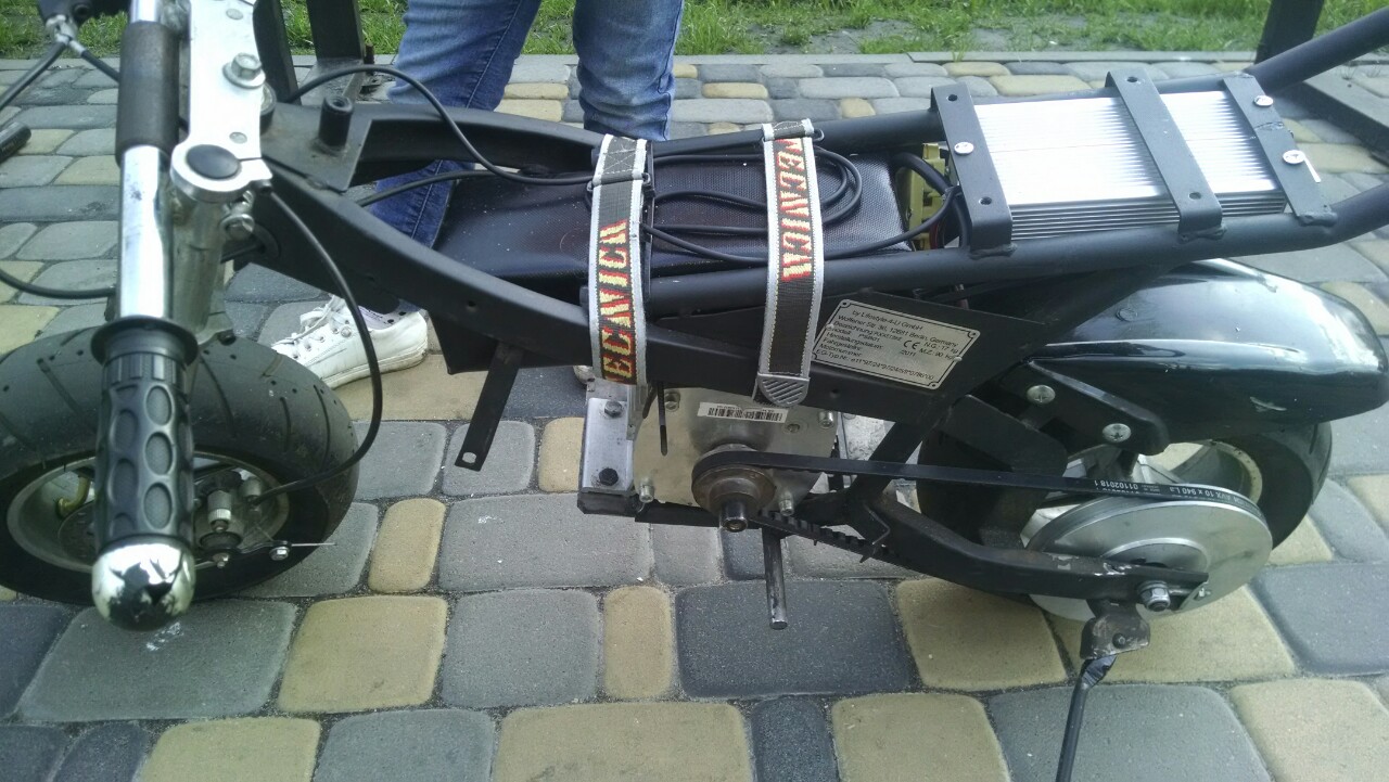 Сначала я подумал быстренько собрать какой-нибудь трайк или карт для детей из этих двух мотоциклов, но моя дочь Лиля увидела "миникросс" и сказала , что хочет только такой мотоцикл!Пришлось конвертировать его в электричку. Делал всё быстро и дёшево потому что он уже маловат и думаю что это будет игрушка на одно лето, потом построю что то побольше и наверное помощнее. Начал с примерки мотора на раму "миникросса" и покупки подходящей под увеличившиеся колёса звезды. Двигатель прикрепил снизу к маятнику, как показала практика зазора хватает.