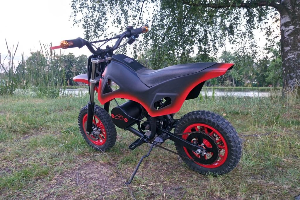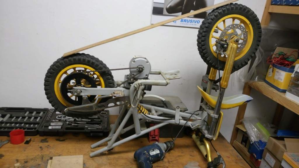 Сначала я подумал быстренько собрать какой-нибудь трайк или карт для детей из этих двух мотоциклов, но моя дочь Лиля увидела "миникросс" и сказала , что хочет только такой мотоцикл!Пришлось конвертировать его в электричку. Делал всё быстро и дёшево потому что он уже маловат и думаю что это будет игрушка на одно лето, потом построю что то побольше и наверное помощнее. Начал с примерки мотора на раму "миникросса" и покупки подходящей под увеличившиеся колёса звезды. Двигатель прикрепил снизу к маятнику, как показала практика зазора хватает.