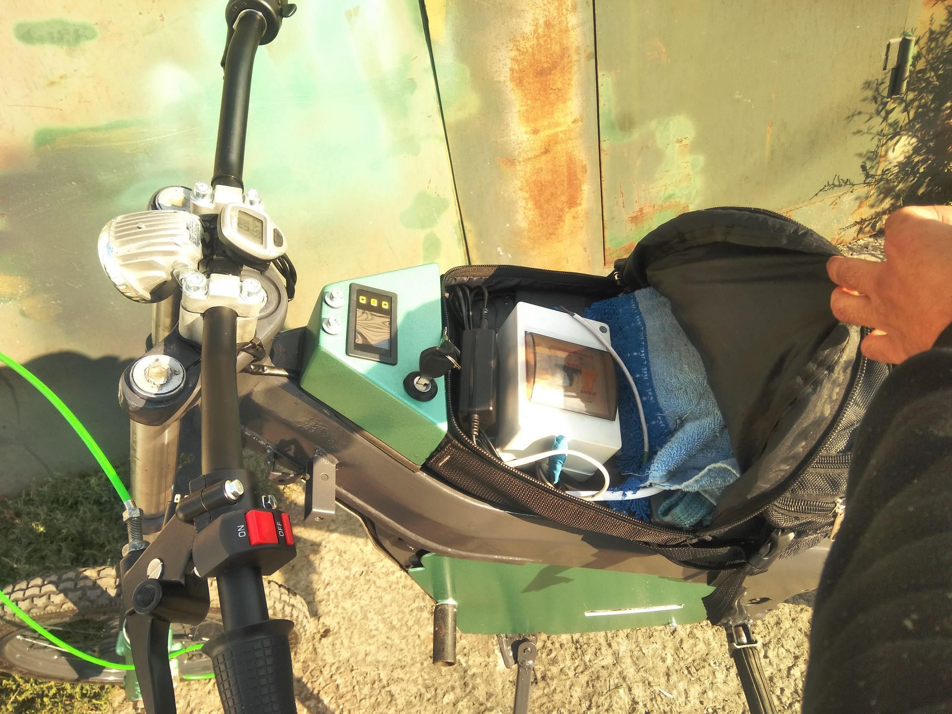 Сегодня были первые покатухи по городу. Точне первые были на прошлых выходных, но не было ещё зарядки, тормозил рекуперацией при отпускании газа и накатал всего 10км. Сейчас убрал плохие соединения в проводке, от батарейки идут провода на 25мм². Стоит один автомат на включение мозгов контроллера и от него резистор на заряд конденсаторов силовой части, на силовую часть отдельно автомат на 125А и один автомат на свет и ваттметр. Пока ещё обкатываю, выявляю основные косяки конструкции, что-то допиливаю. Потому и не покрашен. Вывел ещё кнопку на руль на включение рекуперации/тормоза и сделал чтоб он мог при отпускании ручки газа накатом идти.