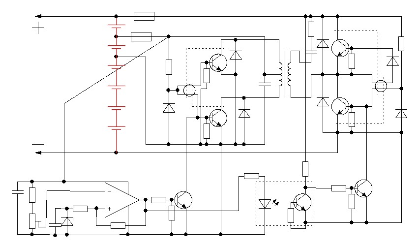 Внизу схемы компаратор и два транзистора служащие для включения того или оного преобразователя (выключение их путем срыва генерации).