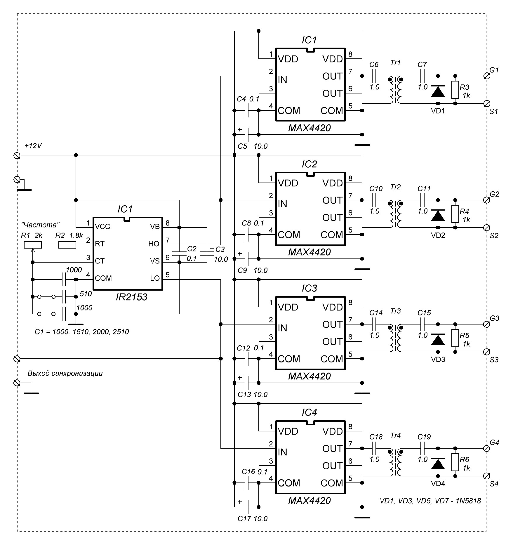 Схема драйверов сильно избыточна. Ниже моя схема семилетней давности (это какие деньжища можно сэкономить! :lol: ). Вместо 3100 можно 4420 ставить. Резистором R3 подгоняется качество синала (без выбросов и завалов).
