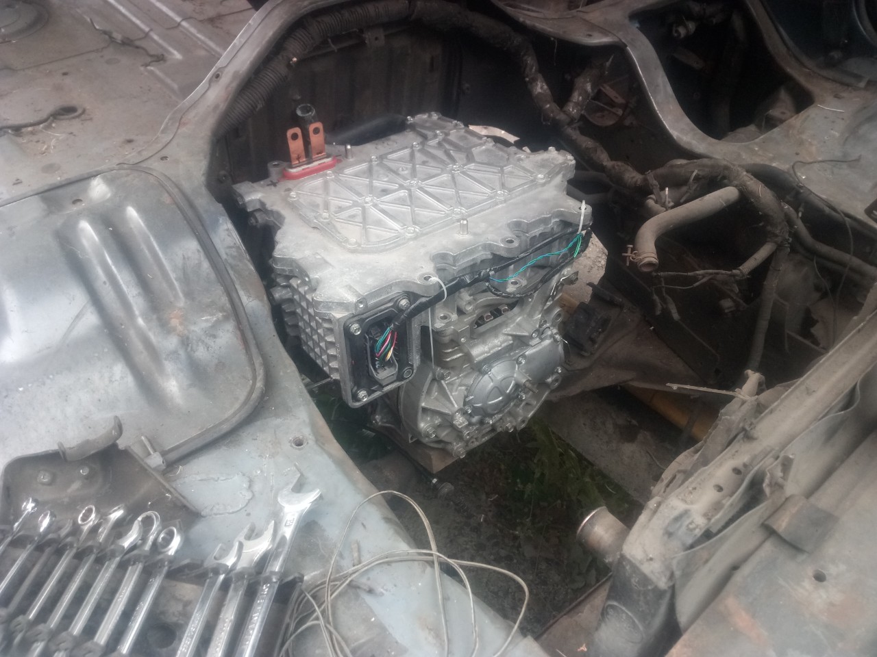 Видео снималось по частях, еще очень давно, на данный момент есть проблема с запуском зарядки. К тому моменту было решено подзарядить батарею для того что б добраться до места стоянки своим ходом,восстановил проводку, а именно свет, повороты и стоп сигналы. На новой роботе договорился за то что б можно было крутить машину,и было решено все же снять двигатель с коробкой для того что бы выяснить и устранить причину звука, снятие заняло около 30-40 минут, прилагаю фото: