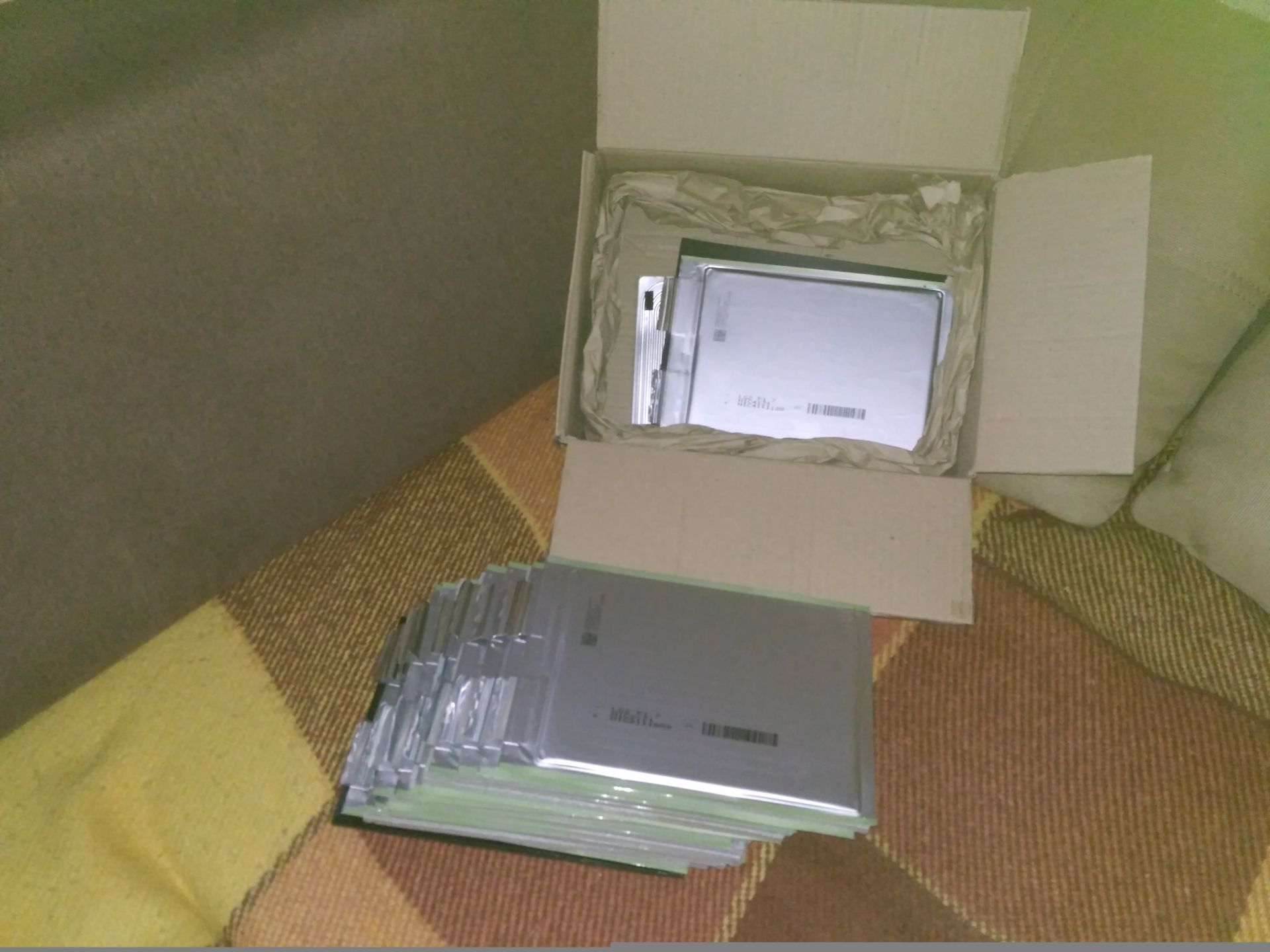 Стоят точно так же как на вашей картинке, упакованы в жесткий ПВХ короб, между пластинами контактов проложена подложка для ламината, главное что бы не болтались внутри, езжу на электровеле год, полет нормальный.