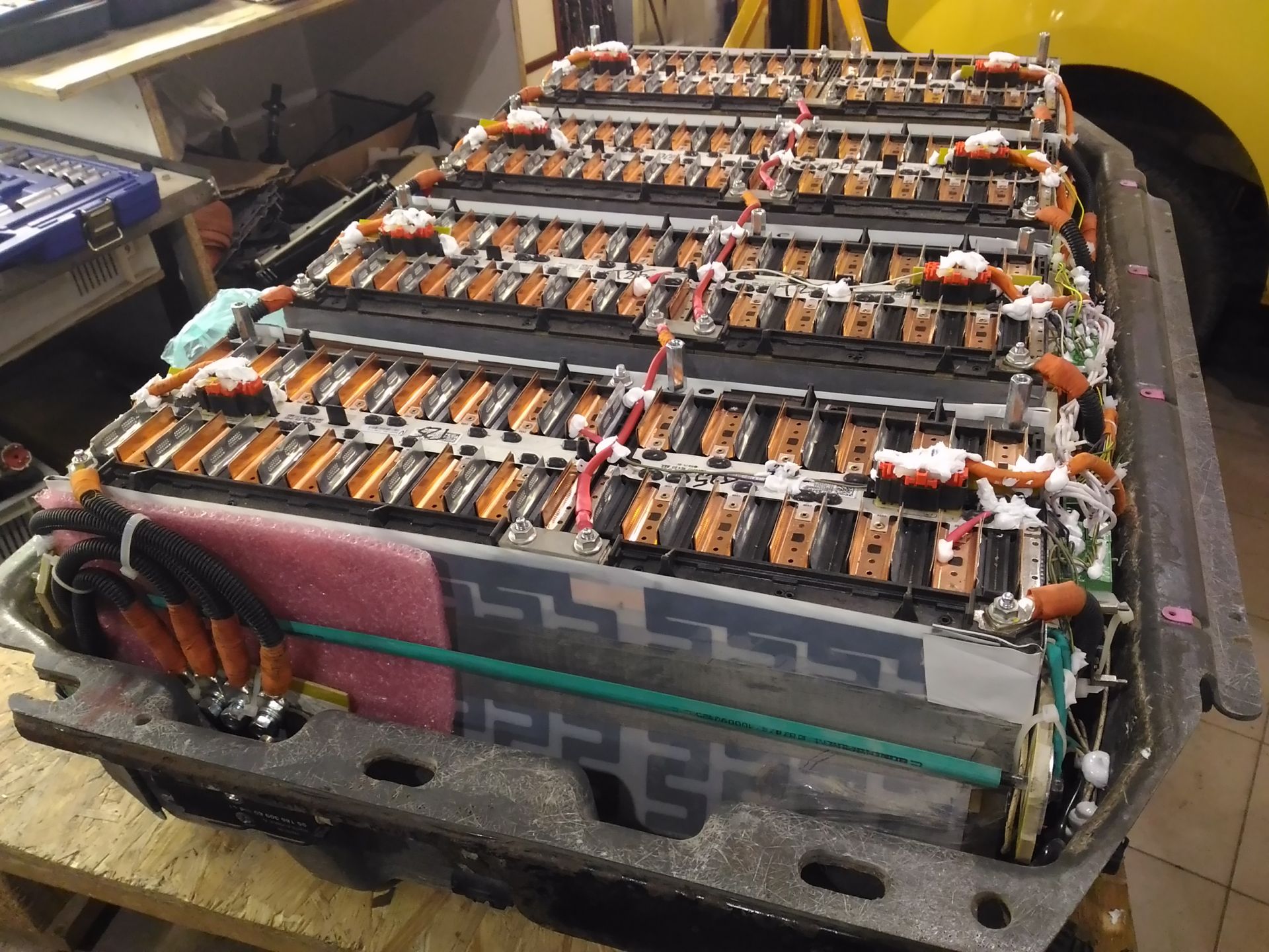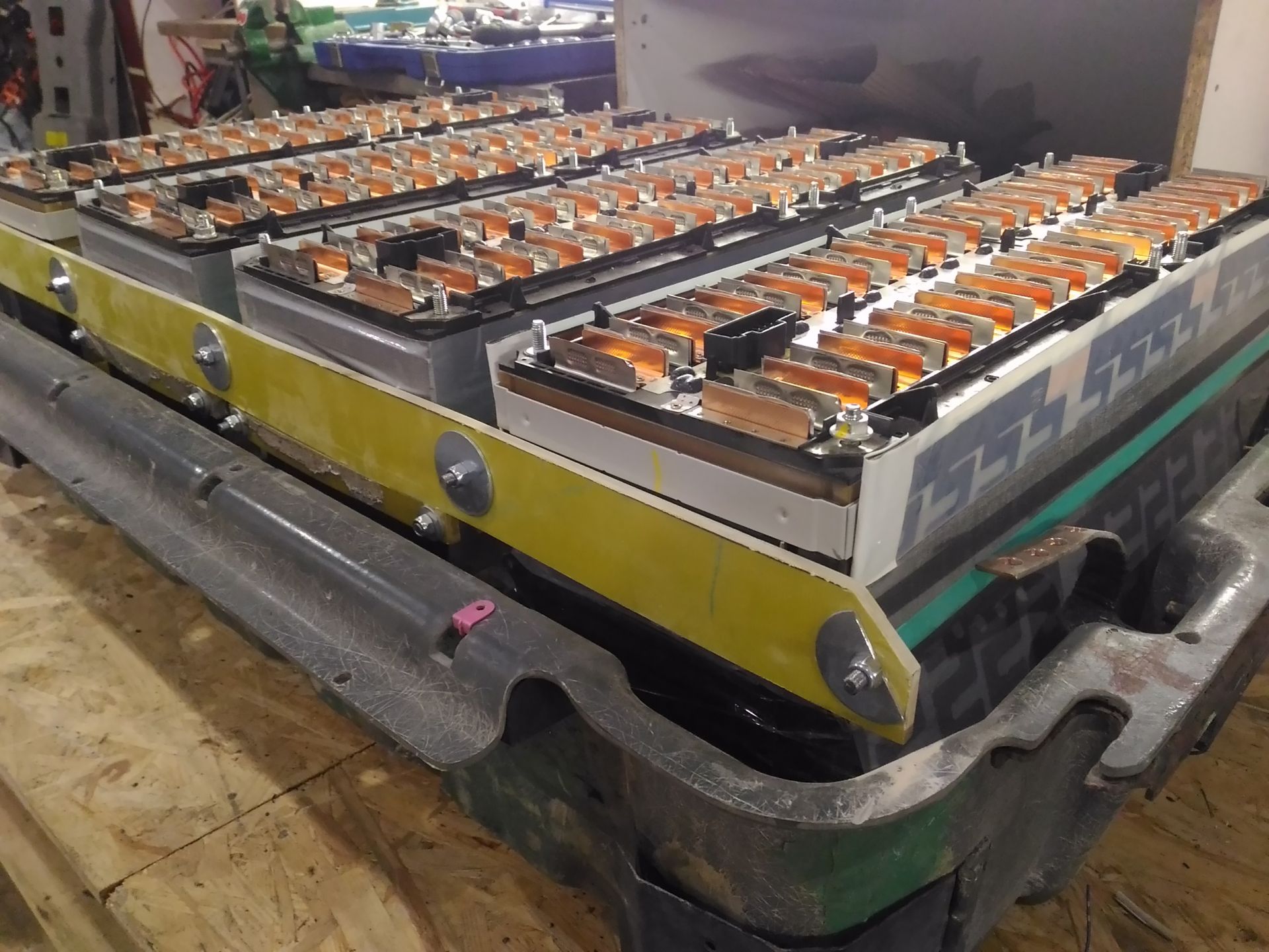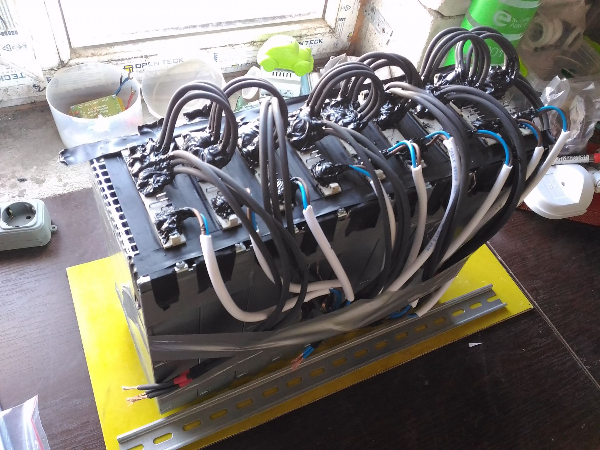 Начал скручивать блоки для зарядки. Будет 3 ветки по 3 блока в каждом. Максимальная выходная мощность 12,5 кВт. На фото выхлопные отверстия заклеены изолентой, чтоб внутрь не накапал герметик при фиксации проводов.
