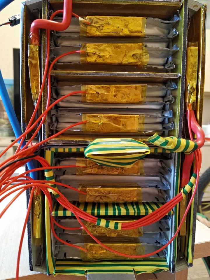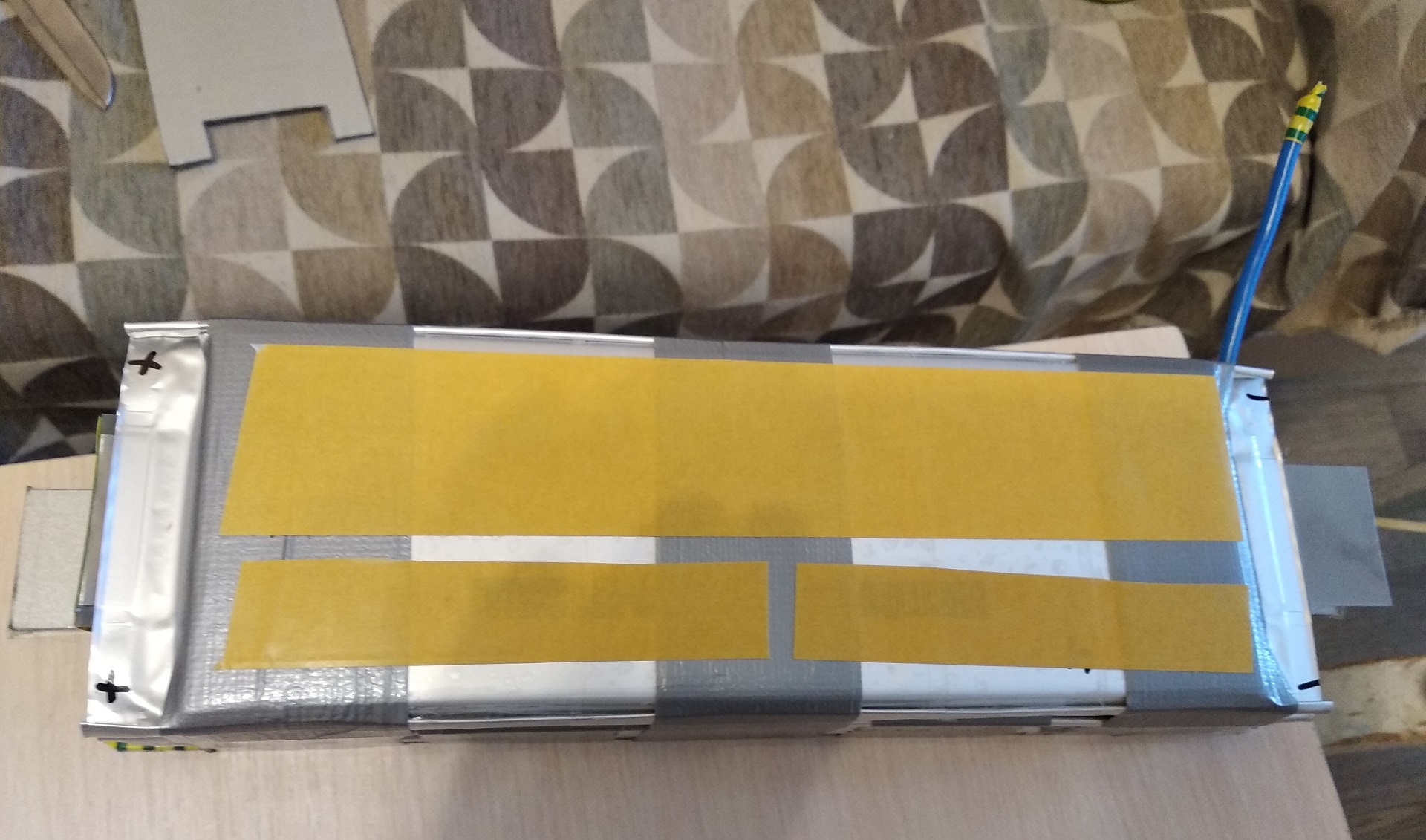В угоду надежности сборки решили делать акум неразборный. Тоесть скотчи, двухсторонные и армированный... Классика. Жестким материалом по краям и перемычки между 4-мя пакетами делались из композитного материала Alukobest (алюминий-пластик-алюминий). Получается низкий вес, и хорошая жесткость.