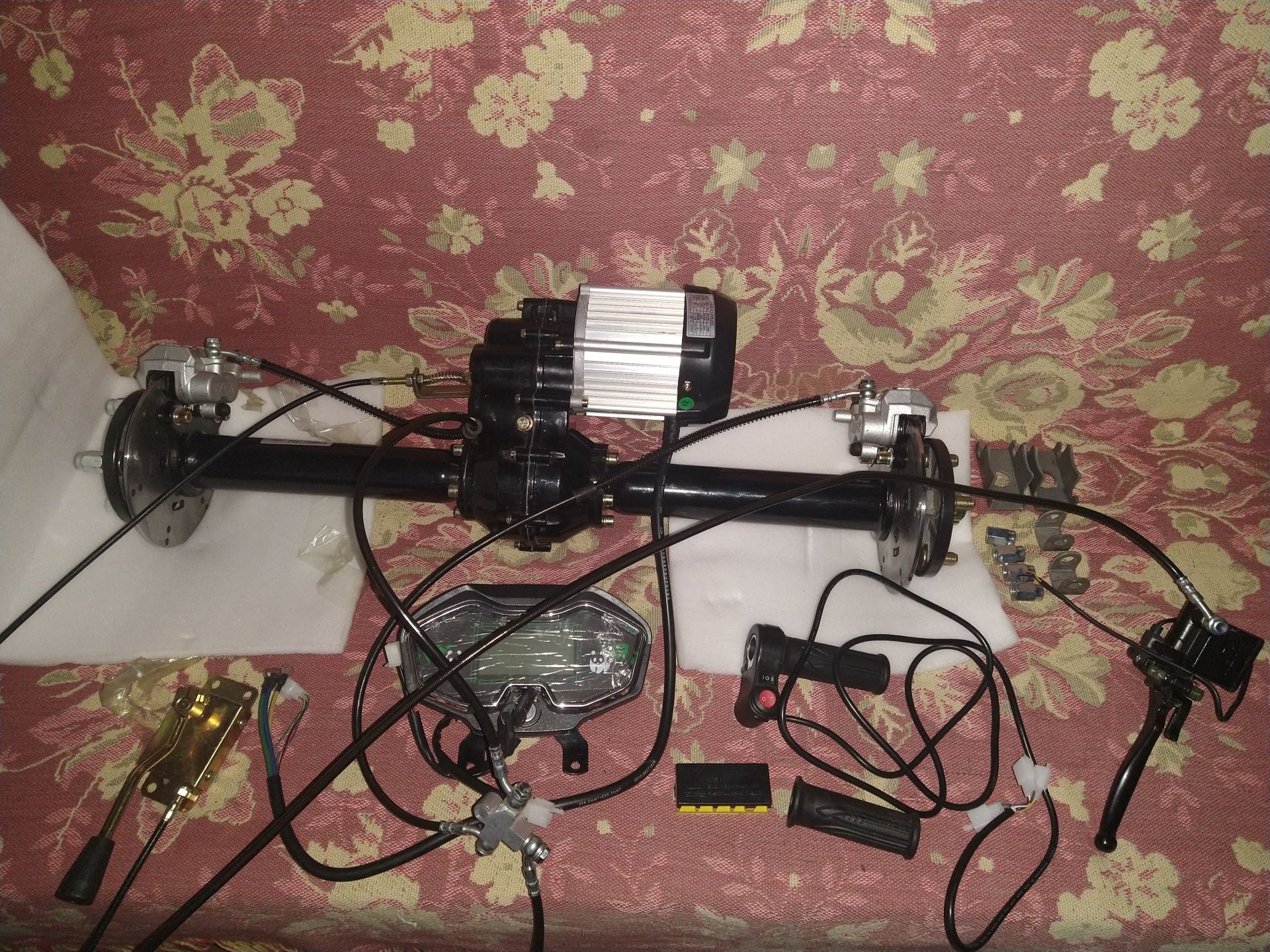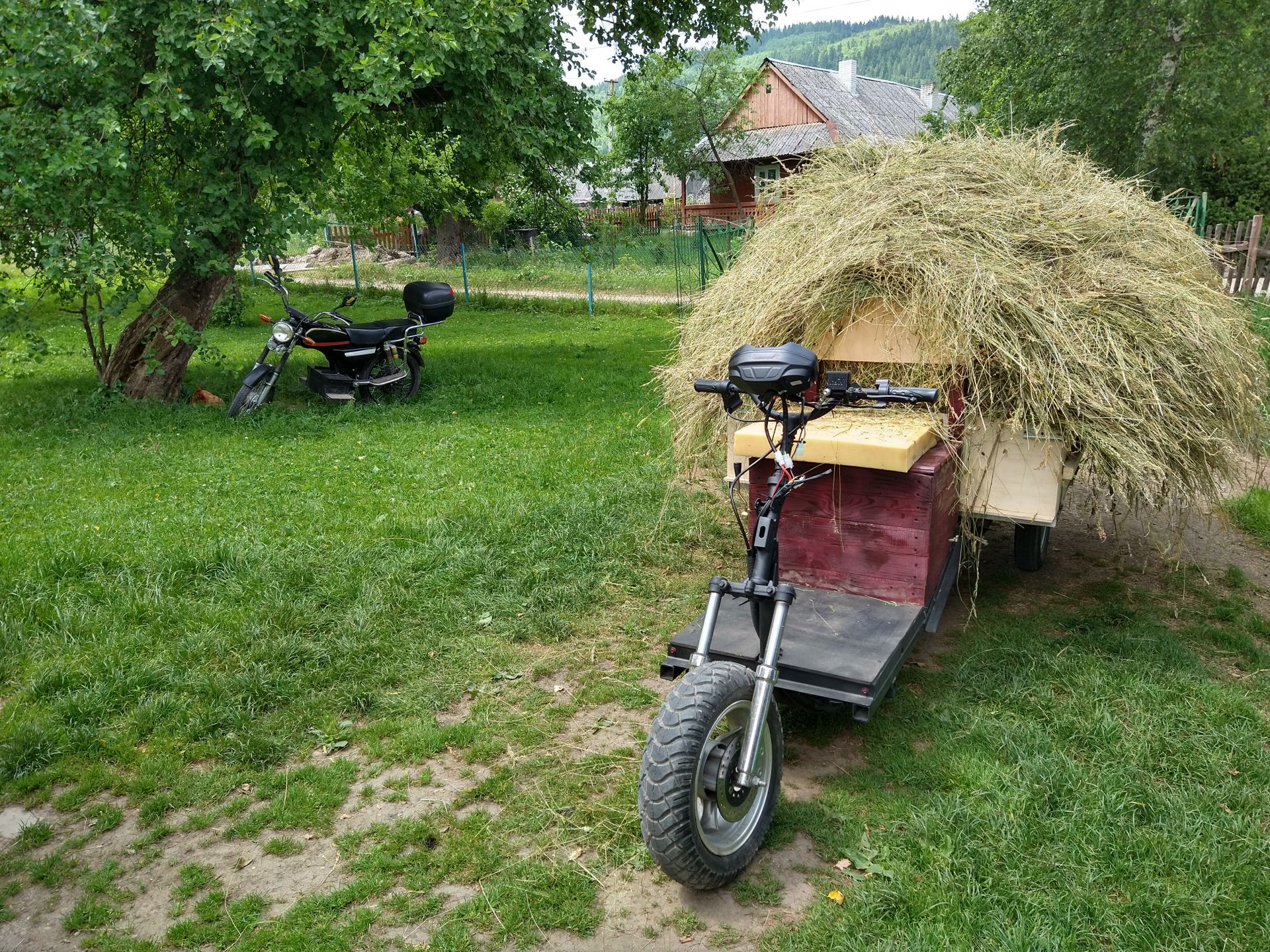 Після того, як в далекому 2016 році, було власноруч зроблено електромопед альфа, який і по сьогоднішній день радує. В голові засіла думка, зробити електричний трайк, який би виручав по господарству. Привезти мішки з картоплею, сіно і т.д. Весною на аліекспрес, замовив комплект: електричний міст - 80 см, 60В/1200Вт, контролер 48-60В, 55А, гідравлічна система двохпоршньова, тросік для вкл/викл пониженої... Хотів купити в Україні у вольти, але на той момент в наявності не було та і гальма хотілося не барабанні, а гідравлічні. Спочатку планував використати в якості донора раму від восхода 2, зробити короткий трайк з причепом. Але гідролінія, виявилася аж 2,5м, (продавець під час спілкування сказав, що гідролінія -1,5м). Тому вирішив, зробити довгий трайк з бортами. На олх, купив раму від скутера Фада 150 кубів, що послужила донором до якої приварена основна рама. Рама із профільної труби 40х40х3. Кузов із водостійкої фанери 9мм. Задня підвіска відсутня. Фазні провода з двигуна - 6мм кв. Якщо вірити опису на даний двигун, то крутний момент при 60 вольтах - 287 N.M. Випробування показали, як і було задумано на початку, що з такою шириною моста, трайк має бути коротким! Тому дана версія трайка - буде вкороченою, або все ж таки, даний міст перейде на восход 2.