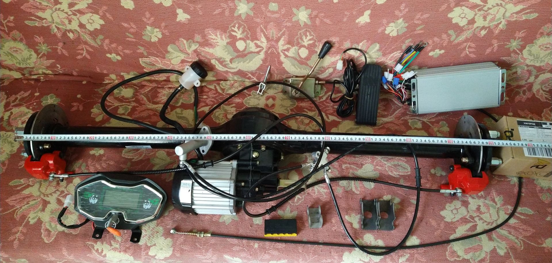 Електричний міст з редуктором та диференціалом - 80см 60В/1200Вт; Контролер - 24 фет, 48-60В, 55А; Акумулятор - 16S 60В, 50Аг (смарт БМС - Ярослава, акумулятори - Володимира); Гальма: передні/задні - гідравлічні; Загальний розмір: довжина - 3,5м, ширина 1,1м; Розмір кузова - 1,95х1,1м; Вага - не важив.